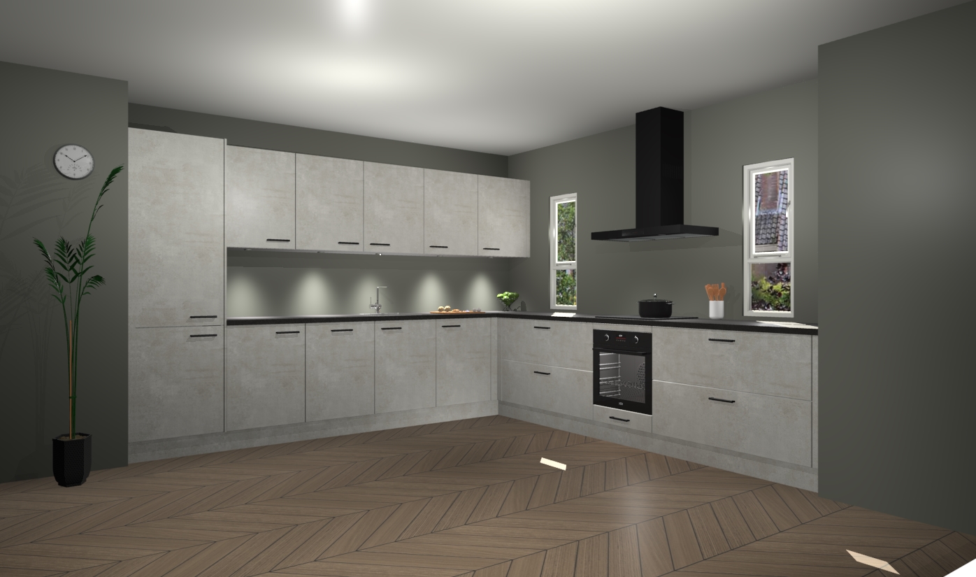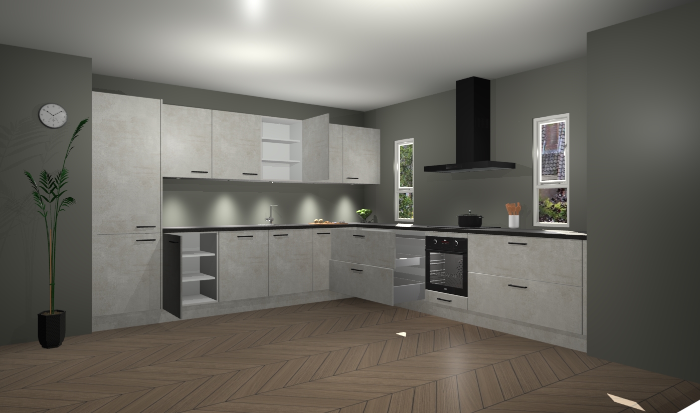 De beton opal keuken is een ideale hoekkeuken en heeft alle functies en apparatuur die u maar nodig kunt hebben. Bij de bestelling krijgt u een oven, inductiekookplaat, afzuigkap, vaatwasser en koelkast - deze kunnen desgewenst eenvoudig worden uitgebreid naar AEG na bestellen. Elke kast wordt ook voor gemonteerd geleverd met soft close deuren die jarenlang gebruik beloven. Stelt u zich voor dat u geen gedoe heeft met vervelende montage - vanaf het moment dat u uw bestelling plaats, duurt het slechts 7 weken voor het bij u thuis geleverd wordt.