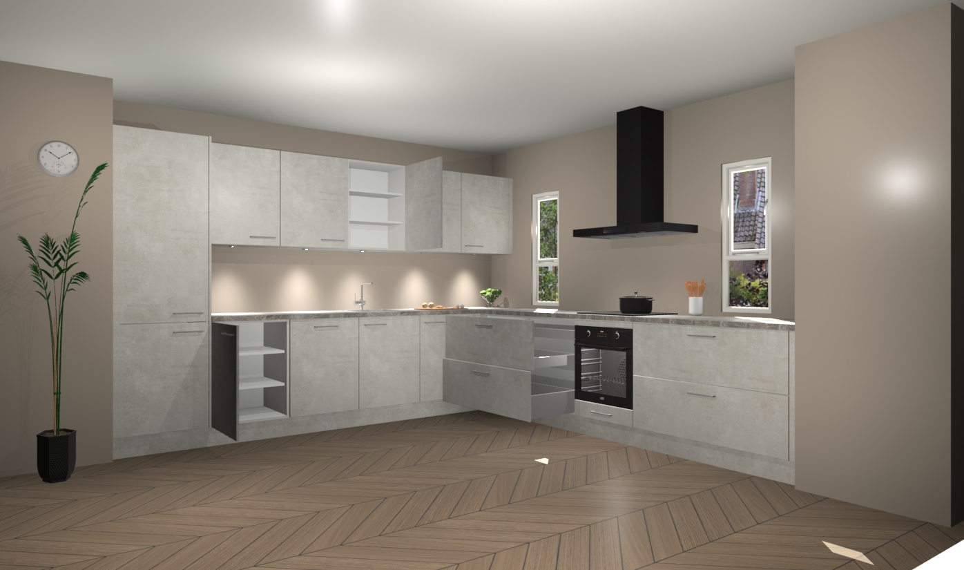 De beton opal keuken is een ideale hoekkeuken en heeft alle functies en apparatuur die u maar nodig kunt hebben. Bij de bestelling krijgt u een oven, inductiekookplaat, afzuigkap, vaatwasser en koelkast - deze kunnen desgewenst eenvoudig worden uitgebreid naar AEG na bestellen. Elke kast wordt ook voor gemonteerd geleverd met soft close deuren die jarenlang gebruik beloven. Stelt u zich voor dat u geen gedoe heeft met vervelende montage - vanaf het moment dat u uw bestelling plaats, duurt het slechts 7 weken voor het bij u thuis geleverd wordt.