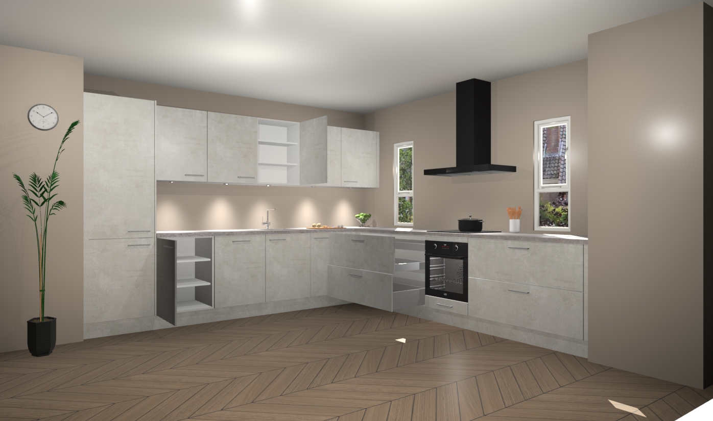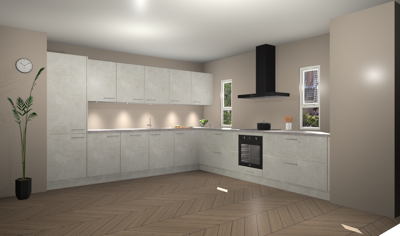 De beton opal keuken is een ideale hoekkeuken en heeft alle functies en apparatuur die u maar nodig kunt hebben. Bij de bestelling krijgt u een oven, inductiekookplaat, afzuigkap, vaatwasser en koelkast - deze kunnen desgewenst eenvoudig worden uitgebreid naar AEG na bestellen. Elke kast wordt ook voor gemonteerd geleverd met soft close deuren die jarenlang gebruik beloven. Stelt u zich voor dat u geen gedoe heeft met vervelende montage - vanaf het moment dat u uw bestelling plaats, duurt het slechts 7 weken voor het bij u thuis geleverd wordt.