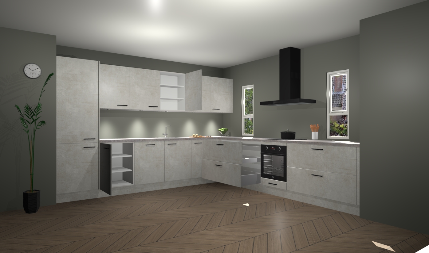 De beton opal keuken is een ideale hoekkeuken en heeft alle functies en apparatuur die u maar nodig kunt hebben. Bij de bestelling krijgt u een oven, inductiekookplaat, afzuigkap, vaatwasser en koelkast - deze kunnen desgewenst eenvoudig worden uitgebreid naar AEG na bestellen. Elke kast wordt ook voor gemonteerd geleverd met soft close deuren die jarenlang gebruik beloven. Stelt u zich voor dat u geen gedoe heeft met vervelende montage - vanaf het moment dat u uw bestelling plaats, duurt het slechts 7 weken voor het bij u thuis geleverd wordt.