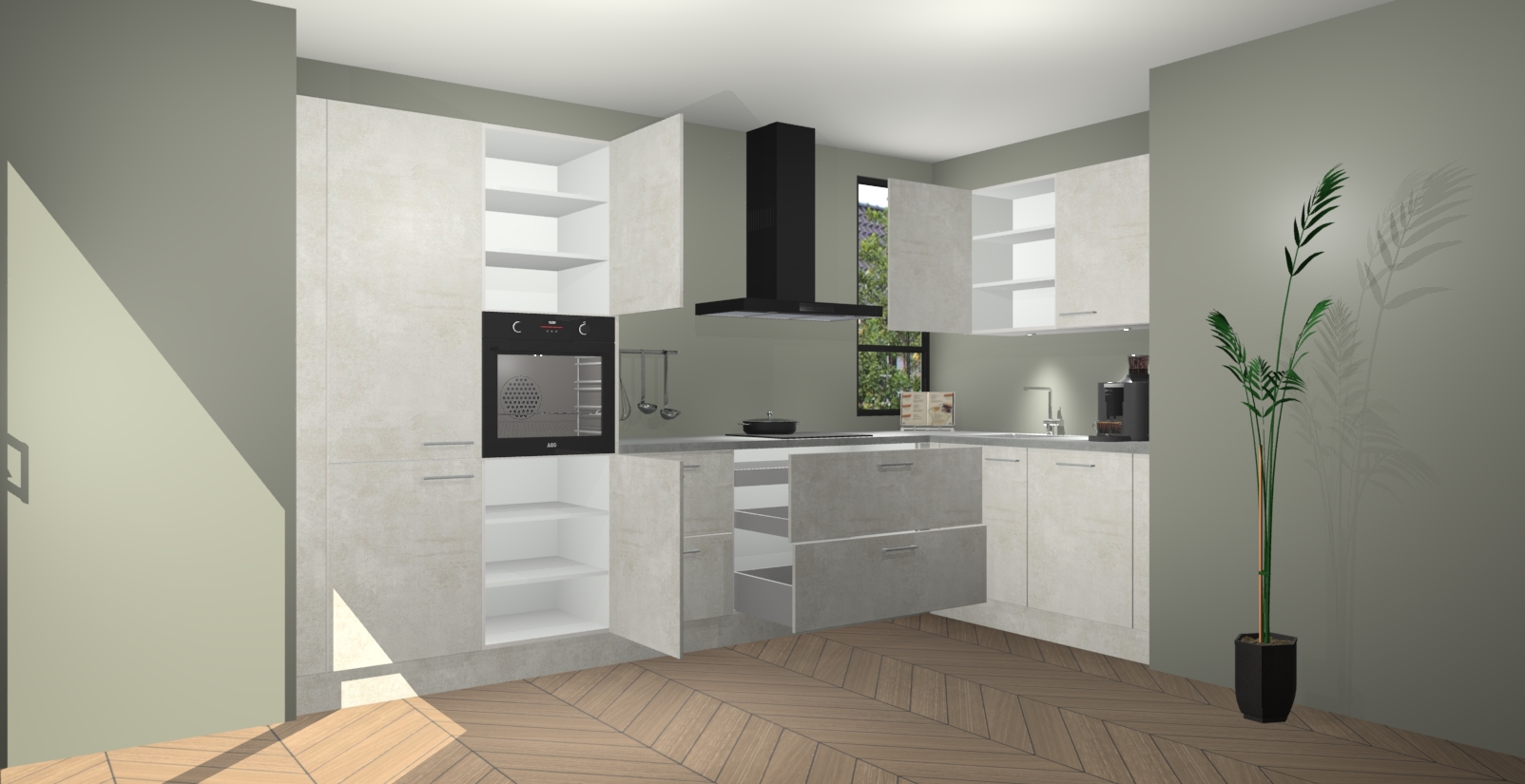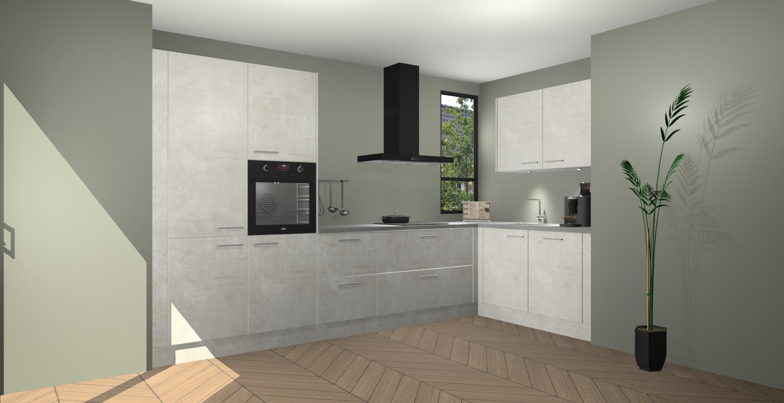 Welkom in uw nieuwe moderne keuken! Laat ons u voorstellen aan de Beton Opal keuken Vlaanderen . Deze prachtige hoekkeuken straalt exclusiviteit en luxe uit als geen ander. Het strakke design, de tijdloze kleuren en het model maken van deze keuken een moderne klassieker. En met voldoende opbergruimte heeft deze keuken echt voor ieder wat wils.