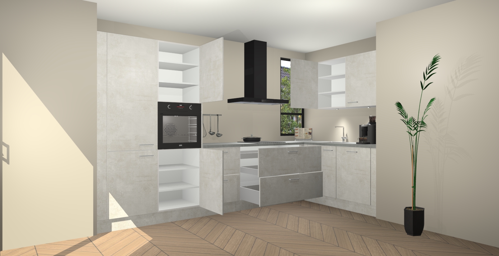Welkom in uw nieuwe moderne keuken! Laat ons u voorstellen aan de Beton Opal keuken Vlaanderen . Deze prachtige hoekkeuken straalt exclusiviteit en luxe uit als geen ander. Het strakke design, de tijdloze kleuren en het model maken van deze keuken een moderne klassieker. En met voldoende opbergruimte heeft deze keuken echt voor ieder wat wils.