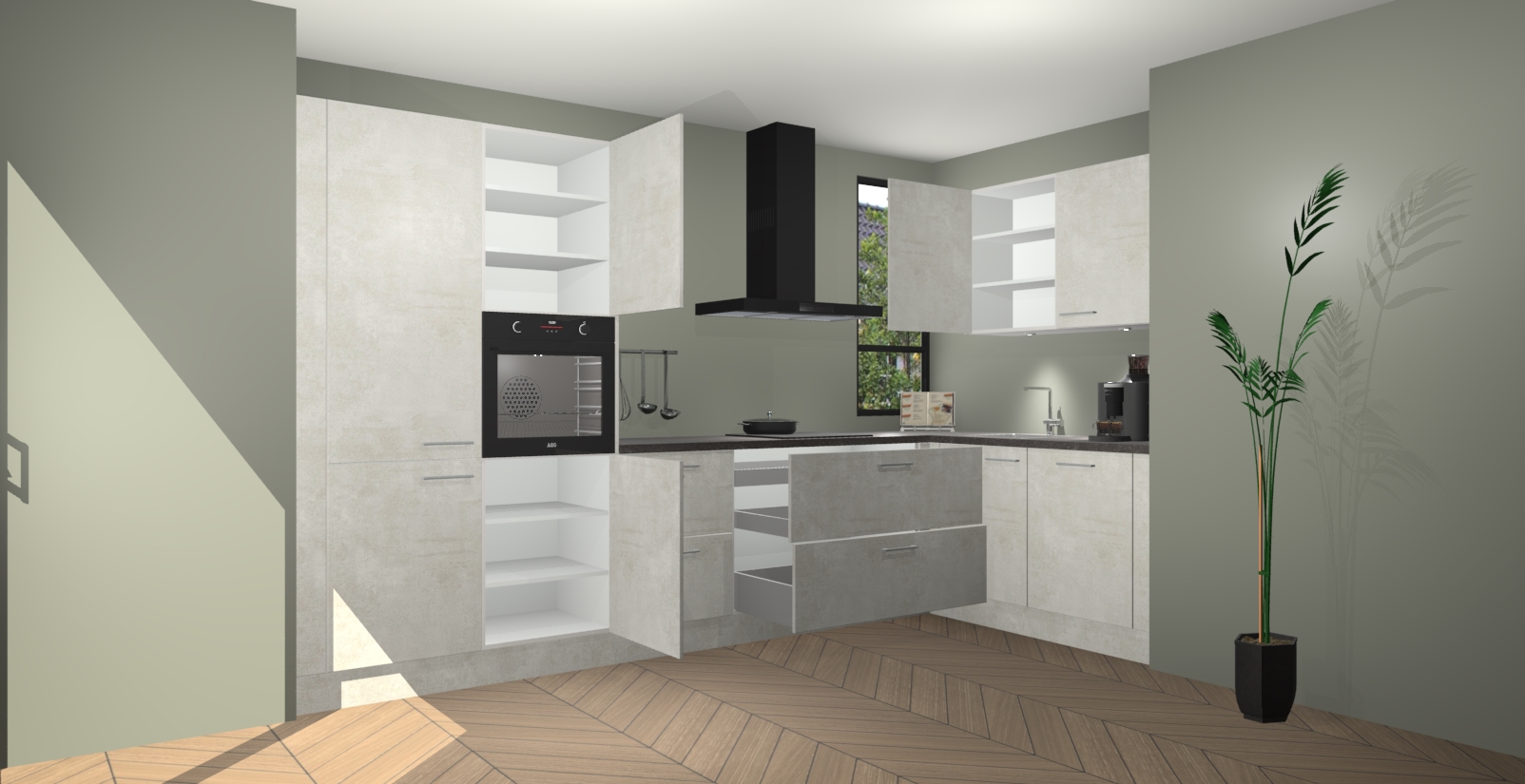 Welkom in uw nieuwe moderne keuken! Laat ons u voorstellen aan de Beton Opal keuken Vlaanderen . Deze prachtige hoekkeuken straalt exclusiviteit en luxe uit als geen ander. Het strakke design, de tijdloze kleuren en het model maken van deze keuken een moderne klassieker. En met voldoende opbergruimte heeft deze keuken echt voor ieder wat wils.