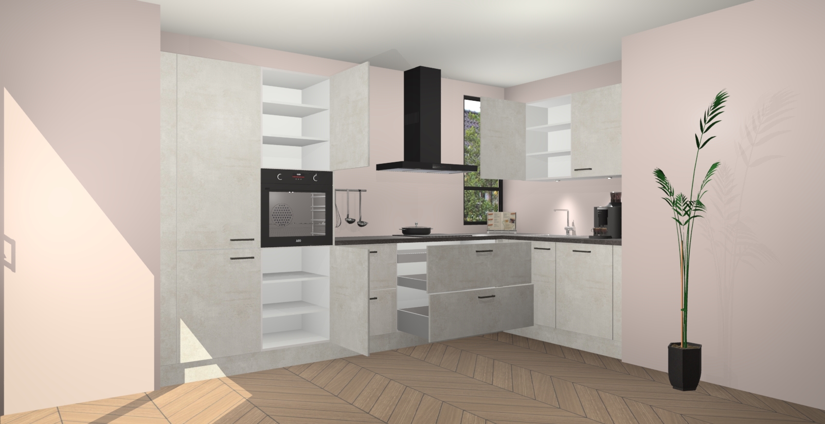 Welkom in uw nieuwe moderne keuken! Laat ons u voorstellen aan de Beton Opal keuken Vlaanderen . Deze prachtige hoekkeuken straalt exclusiviteit en luxe uit als geen ander. Het strakke design, de tijdloze kleuren en het model maken van deze keuken een moderne klassieker. En met voldoende opbergruimte heeft deze keuken echt voor ieder wat wils.