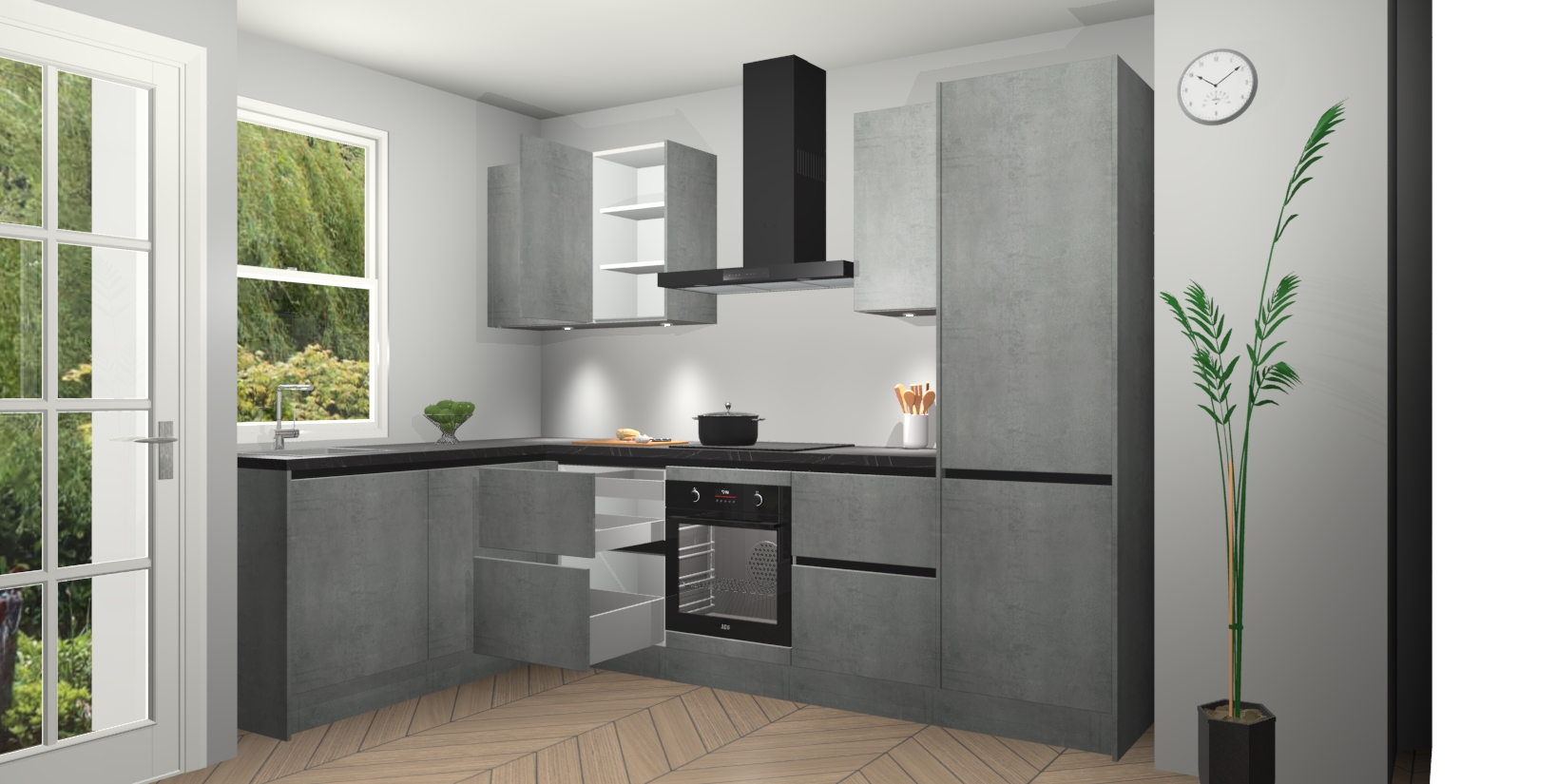 U hoeft zich ook geen zorgen te maken over een gebrek aan opbergruimte, want deze keuken heeft voldoende opbergmogelijkheden zowel boven als onder het aanrecht. Om het leven nog makkelijker te maken, wordt deze moderne hoekkeuken geleverd met 5 ingebouwde apparaten, waaronder een oven, inductiekookplaat, afzuigkap, vaatwasser en koelkast, zodat u in een mum van tijd klaar bent voor actie!