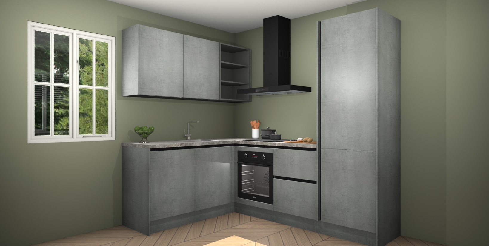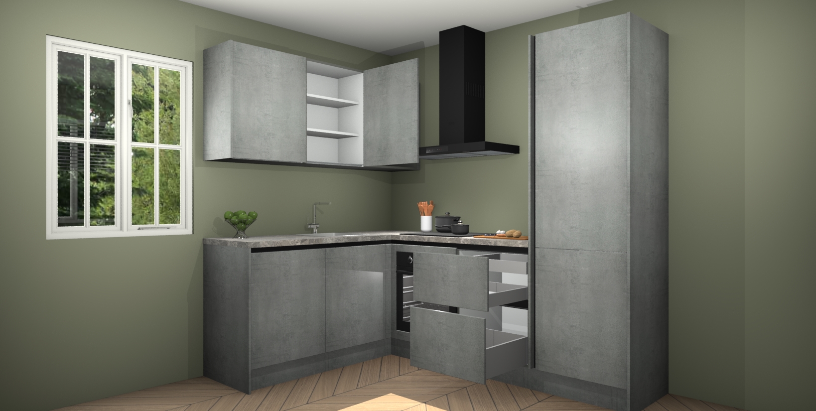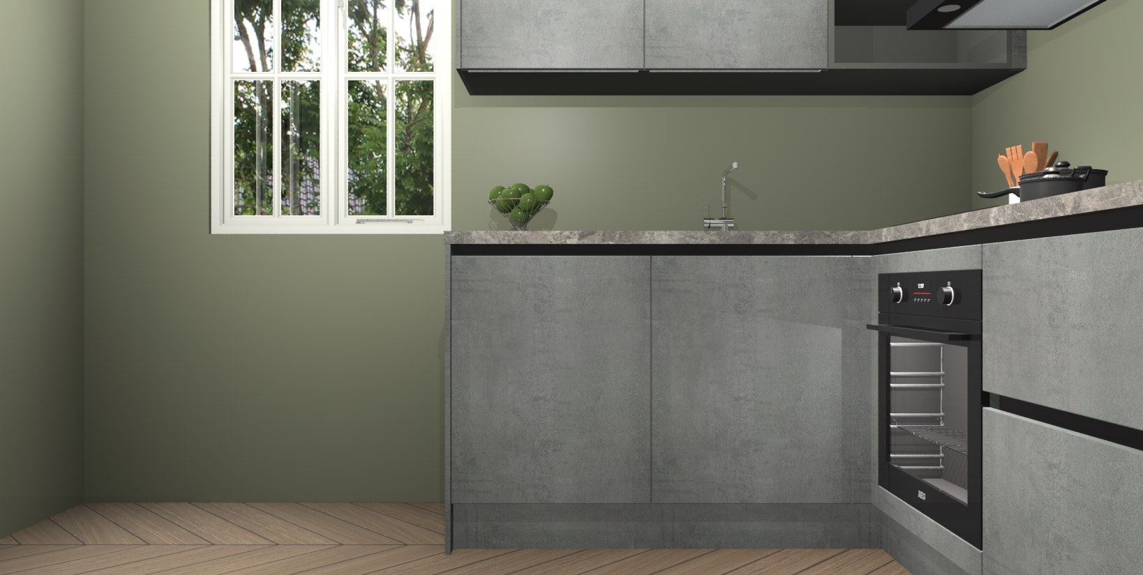 Maak kennis met de Beton Parelgrijs greeploze keuken Boekarest, een moderne hoekkeuken waar al uw vrienden en familie jaloers op zullen zijn! Het verbluffende mooie ontwerp past in elk interieur en is een ideale keuze voor wie op zoek is naar een klassieke, maar verfijnde look.