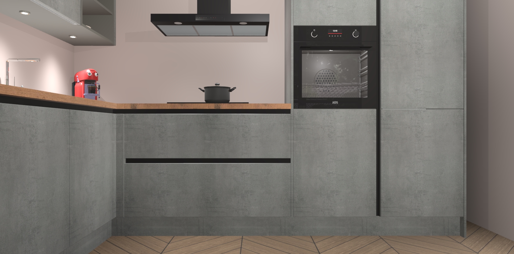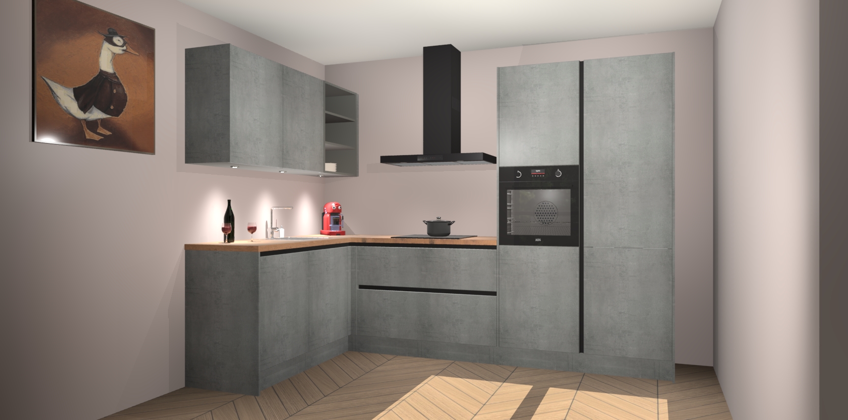 De Beton Parelgrijs greeploze keuken Cognac is een adembenemend ontwerp met een modern en tijdloos uiterlijk. Deze luxe keuken straalt echt aristocratisch uit, waardoor uw koken plezieriger zal worden! Het prachtige design begint bij de hoekkeuken, wat perfect past bij elk type interieur. Bovendien bevat deze hoogwaardige set vijf inbouwapparaten - van oven tot koelkast - die via bestelling naar AEG geüpgraded kunnen worden!