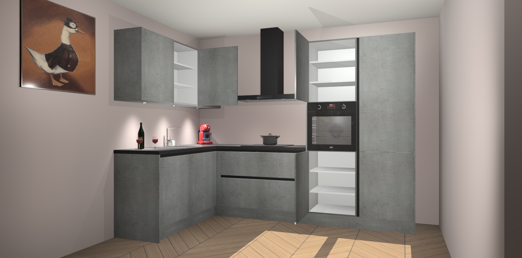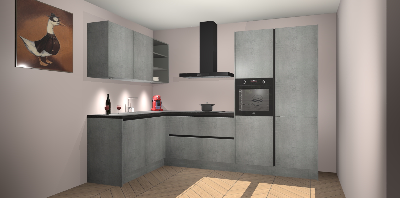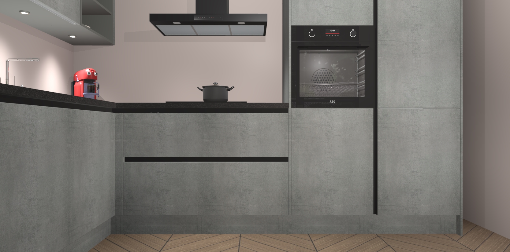 De Beton Parelgrijs greeploze keuken Cognac is een adembenemend ontwerp met een modern en tijdloos uiterlijk. Deze luxe keuken straalt echt aristocratisch uit, waardoor uw koken plezieriger zal worden! Het prachtige design begint bij de hoekkeuken, wat perfect past bij elk type interieur. Bovendien bevat deze hoogwaardige set vijf inbouwapparaten - van oven tot koelkast - die via bestelling naar AEG geüpgraded kunnen worden!