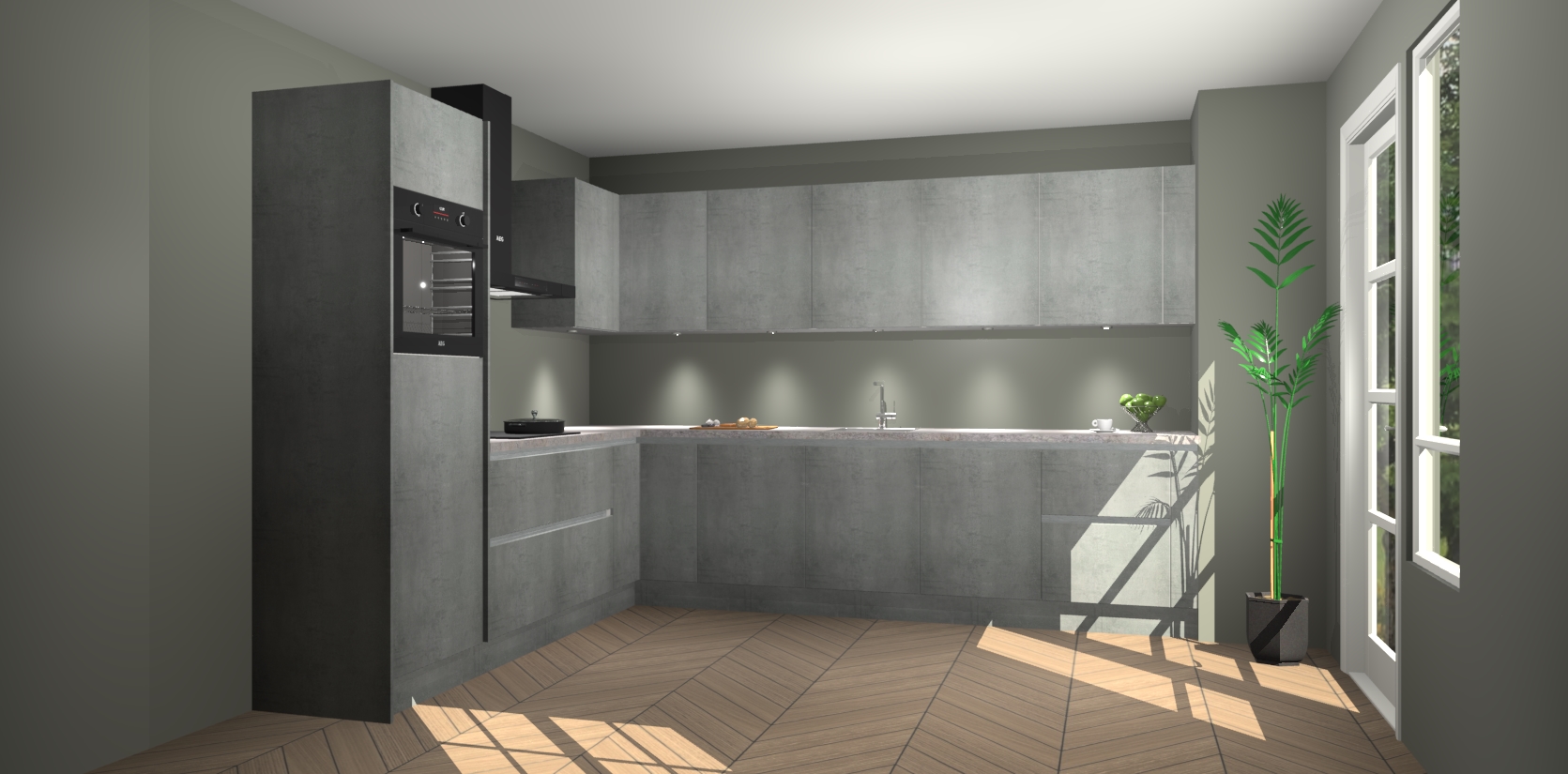 De Beton Parelgrijs greeploze keuken Debar is uitgerust met vijf inbouwapparaten die elke kooktaak handig en efficiënt maken. Een oven, inductiekookplaat, afzuigkap, vaatwasser en koelkast zijn standaard, maar kunnen na bestelling eenvoudig worden geupgrade naar AEG. Profiteer vervolgens van de softclose deuren voor snelle toegang en geruisloze toegang.