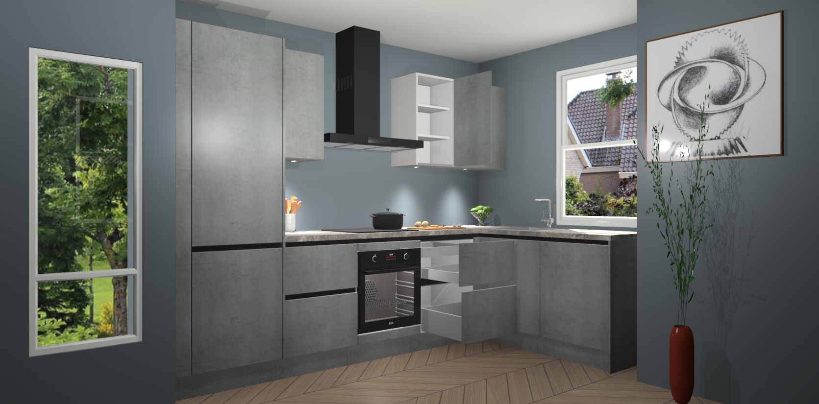 De Beton Parelgrijs greeploze keuken Geneve is uitgerust met 5 inbouwapparaten - een oven, inductiekookplaat, afzuigkap, vaatwasser en koelkast - voor al uw kook- en bewaarbehoeftes. U kunt deze apparaten desgewenst eenvoudig upgraden naar AEG of de oven omruilen voor een combimagnetron na het plaatsen van uw bestelling. En met de soft close deuren, voldoende opbergruimte en kasten die voorgemonteerd worden geleverd, bent u in een mum van tijd klaar om heerlijke maaltijden te bereiden!