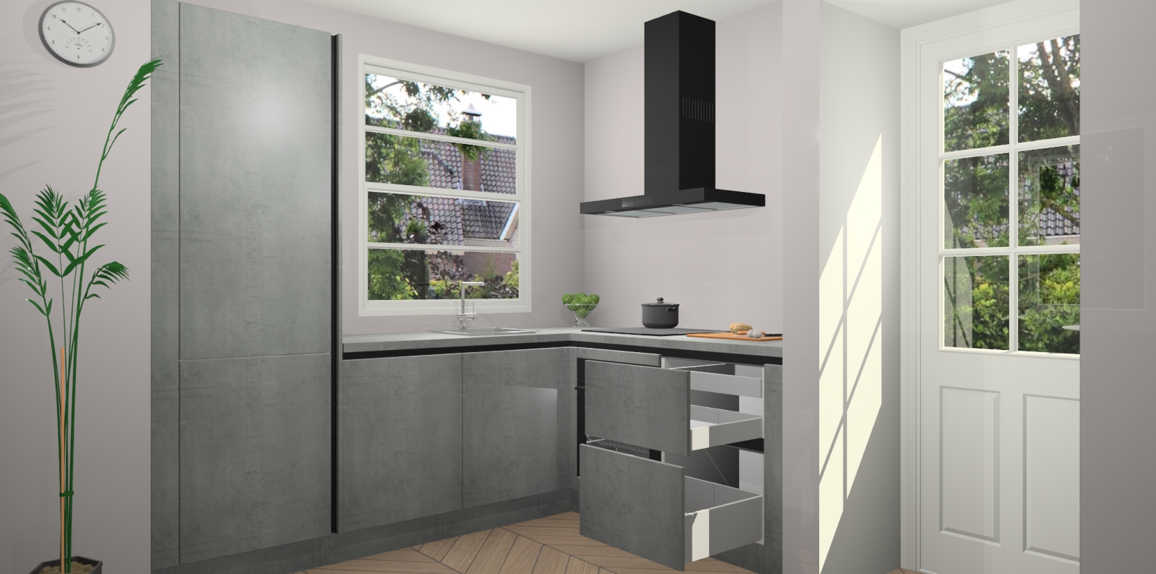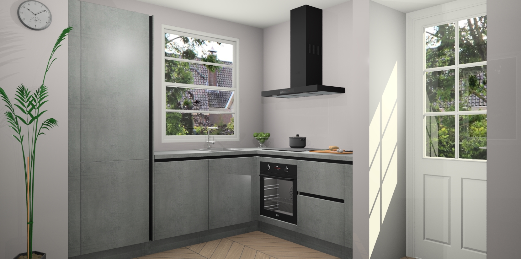Wilt u een echte aanwinst voor uw keuken, maar bent u op zoek naar iets specialers dan de standaardkeukens? Kies dan voor de Beton Parelgrijs greeploze keuken Harbin! Dit prachtige hoekkeukenontwerp geeft u alle ruimte om optimaal te genieten van heerlijk koken. Het uitmuntende afwerkingsniveau, de fraaie houtstructuur en de sfeervolle zwarte grepen maken van de Beton Parelgrijs greeploze keuken Harbin de perfecte keuze voor zowel enthousiaste thuiskoks als design-minded interieurliefhebbers.