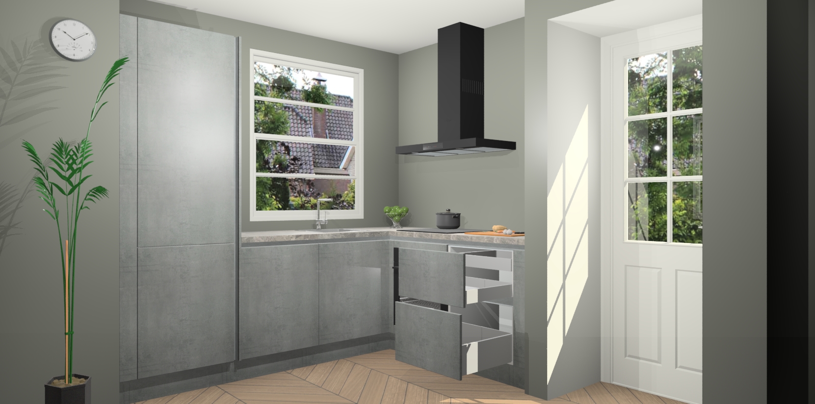 Wilt u een echte aanwinst voor uw keuken, maar bent u op zoek naar iets specialers dan de standaardkeukens? Kies dan voor de Beton Parelgrijs greeploze keuken Harbin! Dit prachtige hoekkeukenontwerp geeft u alle ruimte om optimaal te genieten van heerlijk koken. Het uitmuntende afwerkingsniveau, de fraaie houtstructuur en de sfeervolle zwarte grepen maken van de Beton Parelgrijs greeploze keuken Harbin de perfecte keuze voor zowel enthousiaste thuiskoks als design-minded interieurliefhebbers.