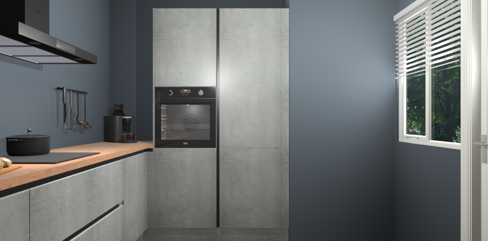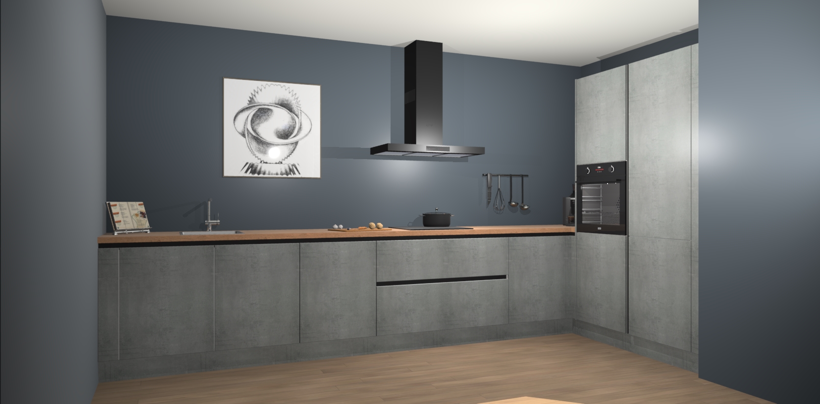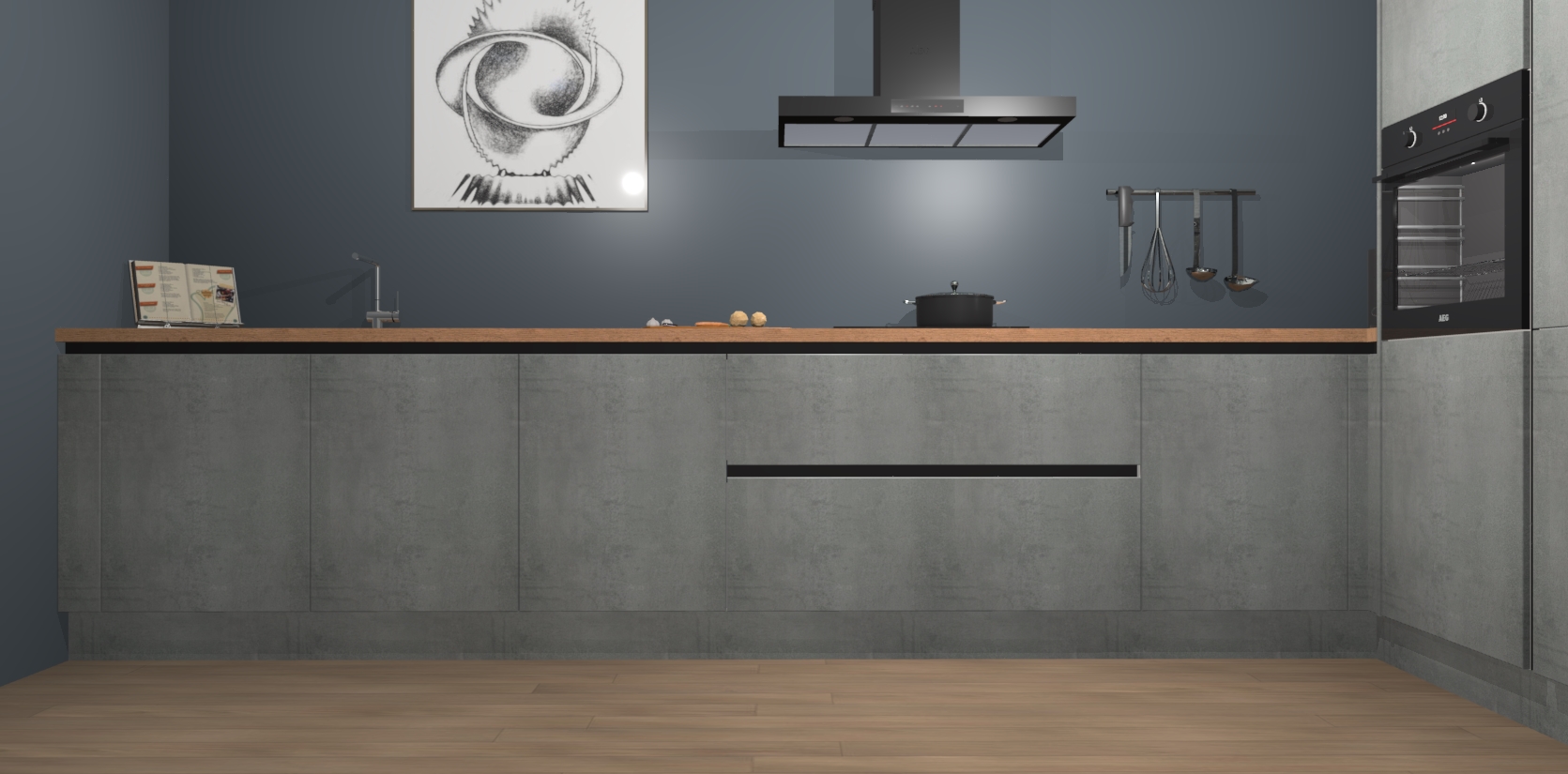 Welkom bij de Beton Parelgrijs greeploze keuken Khao Lak. Deze prachtige keuken zal de komende jaren het middelpunt van de belangstelling in uw huis zijn. Uitgerust met vijf inbouwapparaten komt u nooit kookgereedschap tekort. Bovendien geeft de warme houtlook elke ruimte een uitnodigende en tijdloze uitstraling.