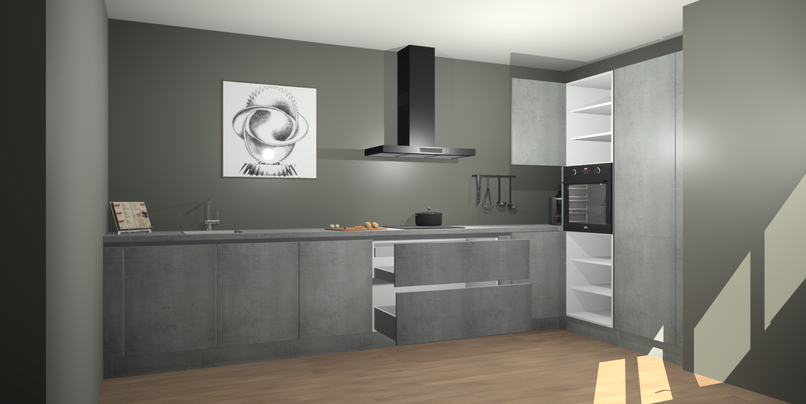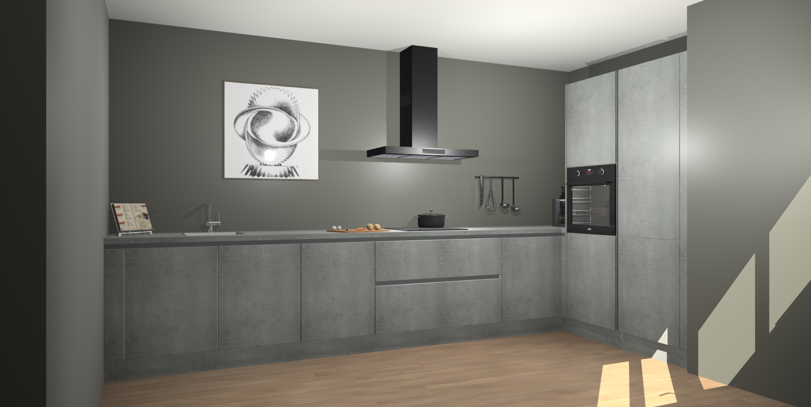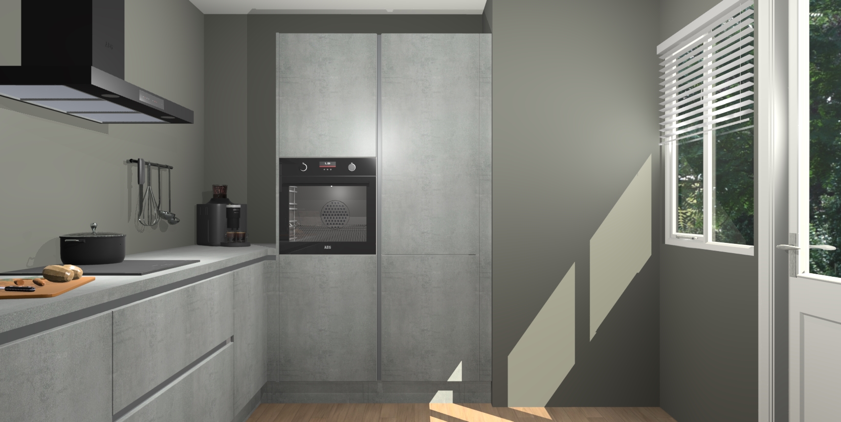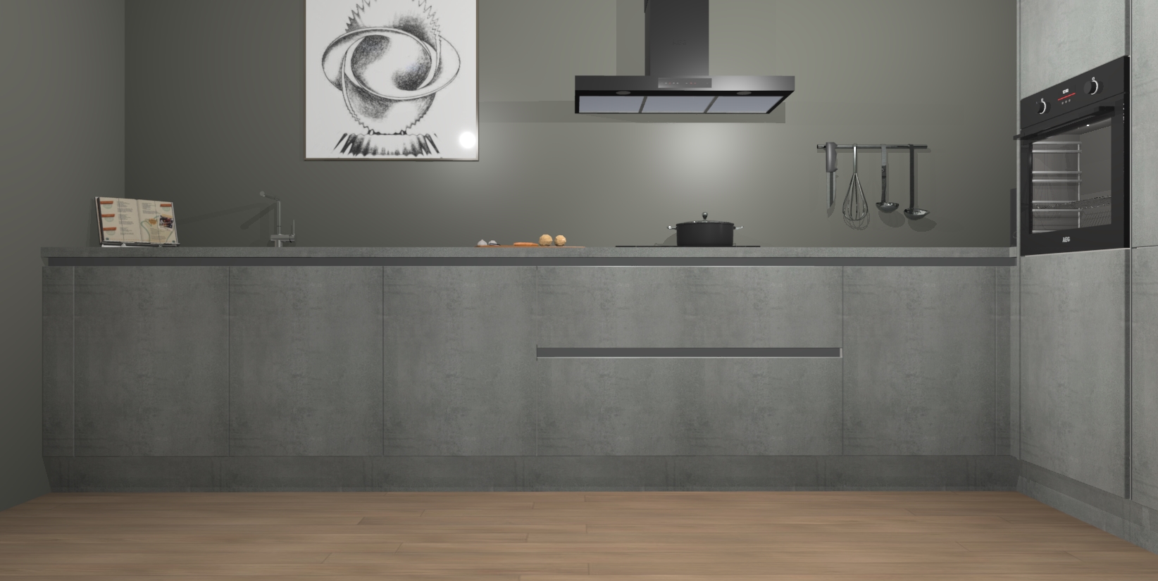 Welkom bij de Beton Parelgrijs greeploze keuken Khao Lak. Deze prachtige keuken zal de komende jaren het middelpunt van de belangstelling in uw huis zijn. Uitgerust met vijf inbouwapparaten komt u nooit kookgereedschap tekort. Bovendien geeft de warme houtlook elke ruimte een uitnodigende en tijdloze uitstraling.