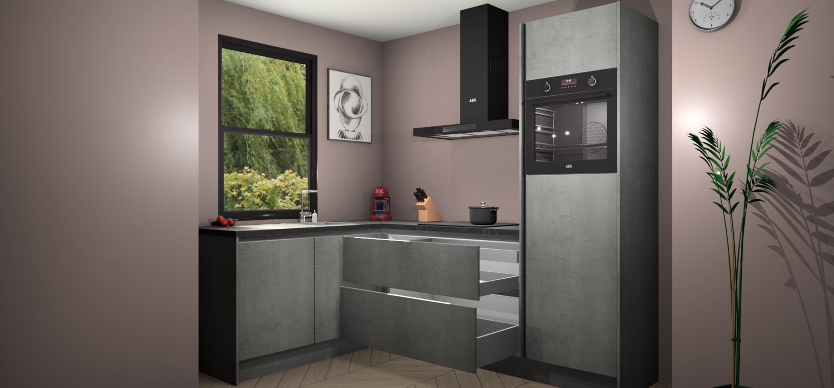 Deze prachtige hoekkeuken heeft alle benodigdheden om uw droomkook- en eetruimte compleet te maken. De Beton Parelgrijs greeploze kasten bieden een echo van raffinement, terwijl de 5 inbouwapparaten genoeg opties bieden voor het bereiden van heerlijke maaltijden. De oven, inductiekookplaat, afzuigkap, vaatwasser en koelkast zorgen ervoor dat u tijd in de keuken zo efficiënt mogelijk verloopt, terwijl ze ook dat extra vleugje luxe bieden.
