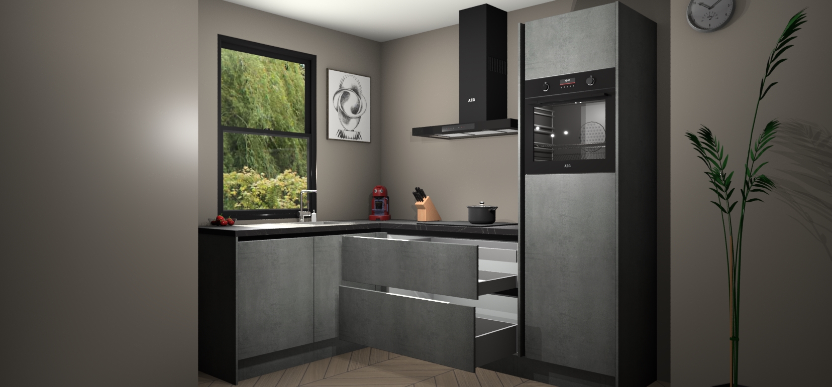 Deze prachtige hoekkeuken heeft alle benodigdheden om uw droomkook- en eetruimte compleet te maken. De Beton Parelgrijs greeploze kasten bieden een echo van raffinement, terwijl de 5 inbouwapparaten genoeg opties bieden voor het bereiden van heerlijke maaltijden. De oven, inductiekookplaat, afzuigkap, vaatwasser en koelkast zorgen ervoor dat u tijd in de keuken zo efficiënt mogelijk verloopt, terwijl ze ook dat extra vleugje luxe bieden.