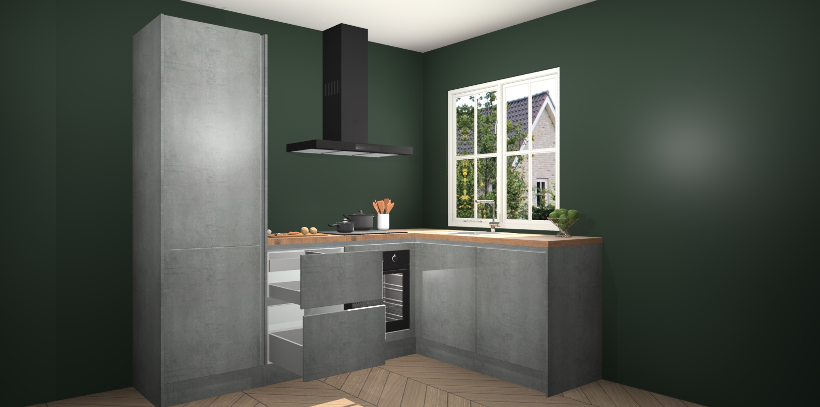 De Beton Parelgrijs greeploze keuken Linz is de perfecte keuze voor uw nieuwe moderne en tijdloze keuken. Ga voor moderne en tijdloze elegantie in uw keuken. De prachtige hoekkeuken biedt een verfrissende kijk op de manier waarop we ons vertrouwde keukenontwerp kunnen aanpassen in een nieuwe stijl. Één blik om alles te zien: zo mooi dat het bijna magisch lijkt.