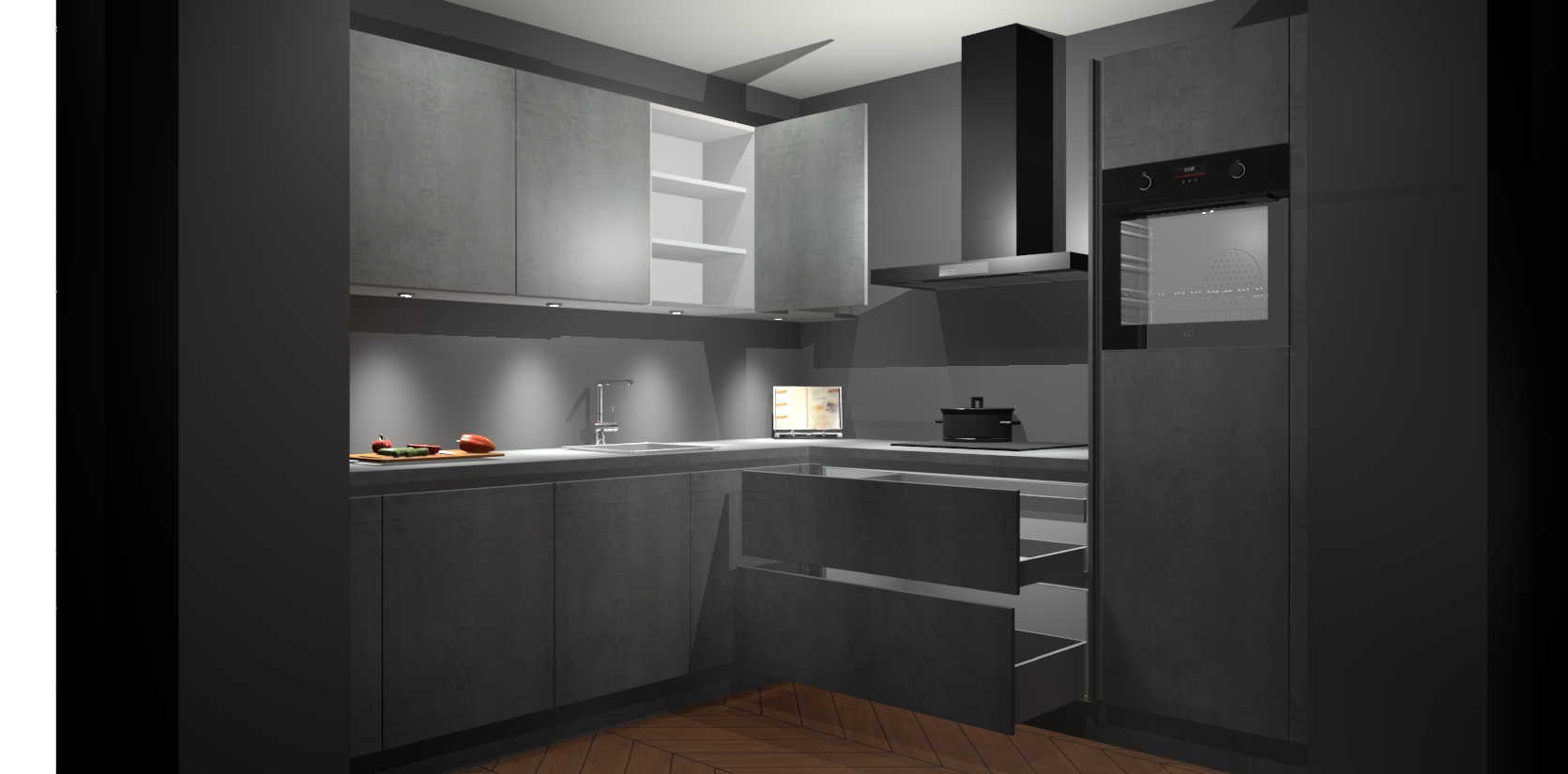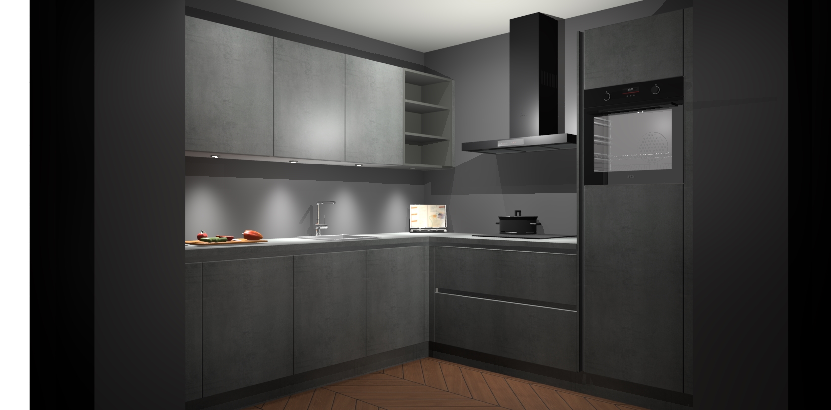 Met een modern, tijdloos design en ruime opslagruimte, zult u zich in no-time thuis voelen in uw nieuwe keuken. Uw leven wordt eenvoudiger met de soft-close deuren die voor het ultieme stille comfort zorgen - geen geluid dat u stoort terwijl u kookt. Ook is de keuken voorzien van 5 ingebouwde apparaten: een oven, inductie kookplaat, afzuigkap, vaatwasser en koelkast. Deze kunnen gemakkelijk na bestelling worden bijgewerkt naar AEG - waardoor uw luxe ervaring compleet is.
