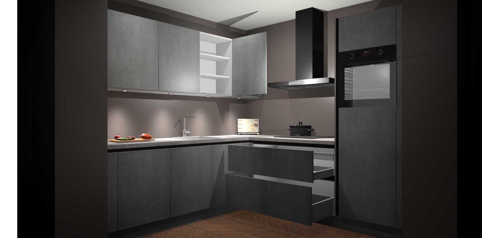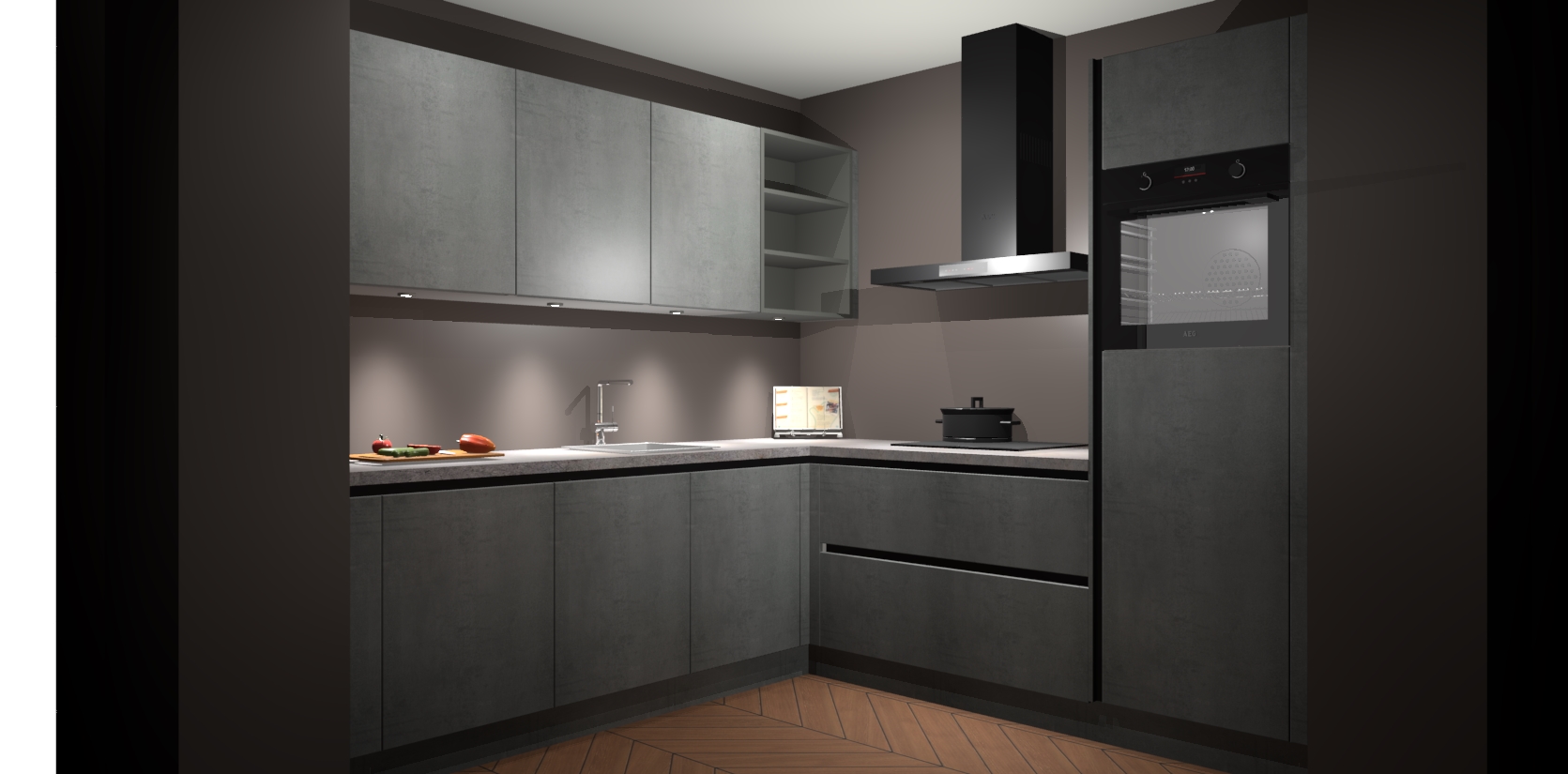 Met een modern, tijdloos design en ruime opslagruimte, zult u zich in no-time thuis voelen in uw nieuwe keuken. Uw leven wordt eenvoudiger met de soft-close deuren die voor het ultieme stille comfort zorgen - geen geluid dat u stoort terwijl u kookt. Ook is de keuken voorzien van 5 ingebouwde apparaten: een oven, inductie kookplaat, afzuigkap, vaatwasser en koelkast. Deze kunnen gemakkelijk na bestelling worden bijgewerkt naar AEG - waardoor uw luxe ervaring compleet is.