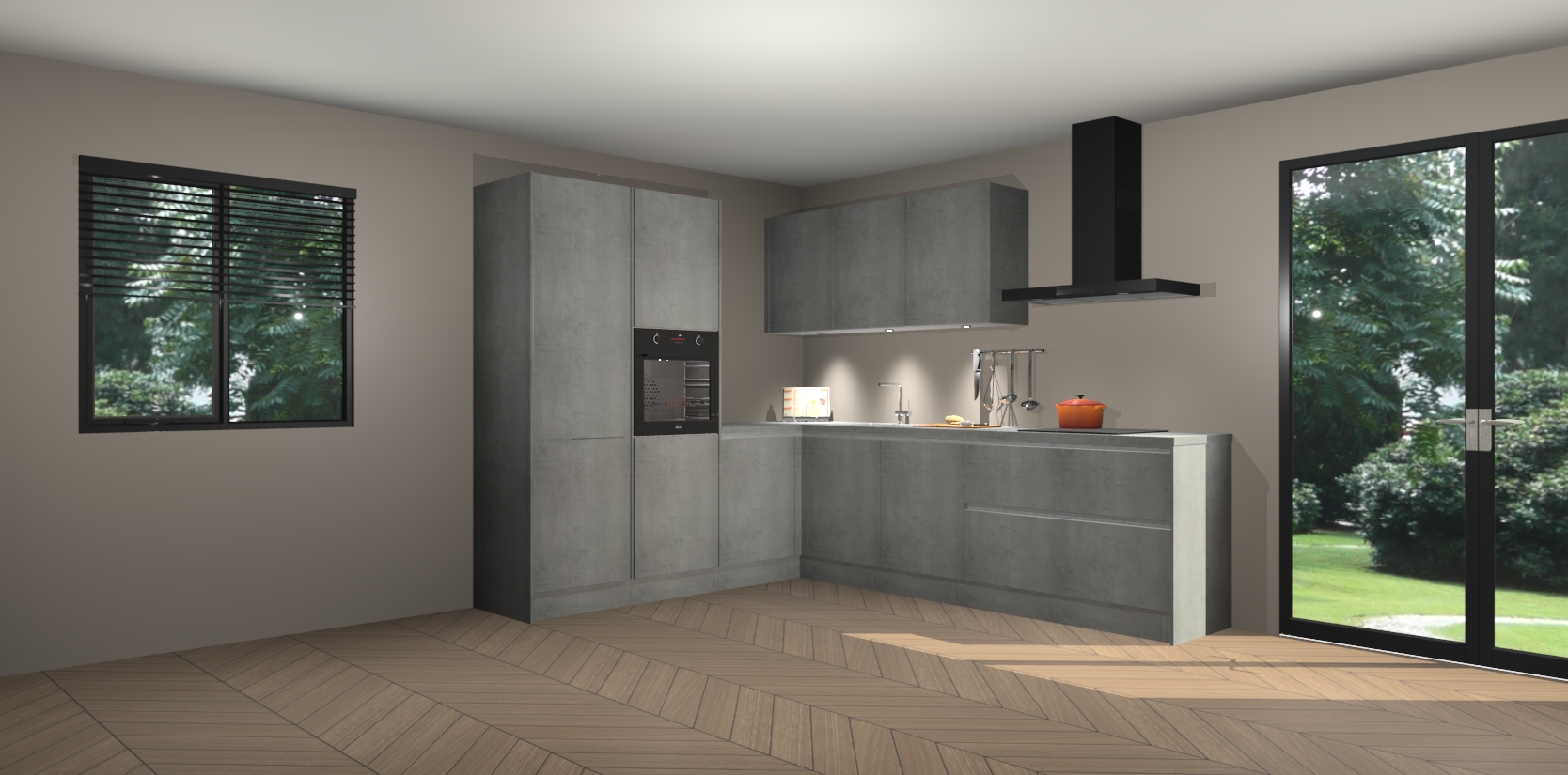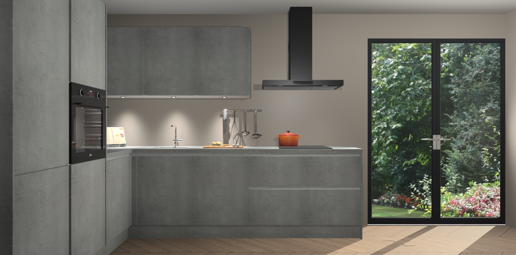Maak kennis met de beton parelgrijs greeploze keuken Parla - de perfecte aanvulling voor uw moderne keuken! Ervaar tijdloos design, elegantie en een chique uitstraling met onze zwarte handgrepen, soft-close deuren en veel opbergruimte. Dit alles wordt aangeboden tegen een vaste lage prijs voor ongeëvenaarde Duitse keukenkwaliteit!