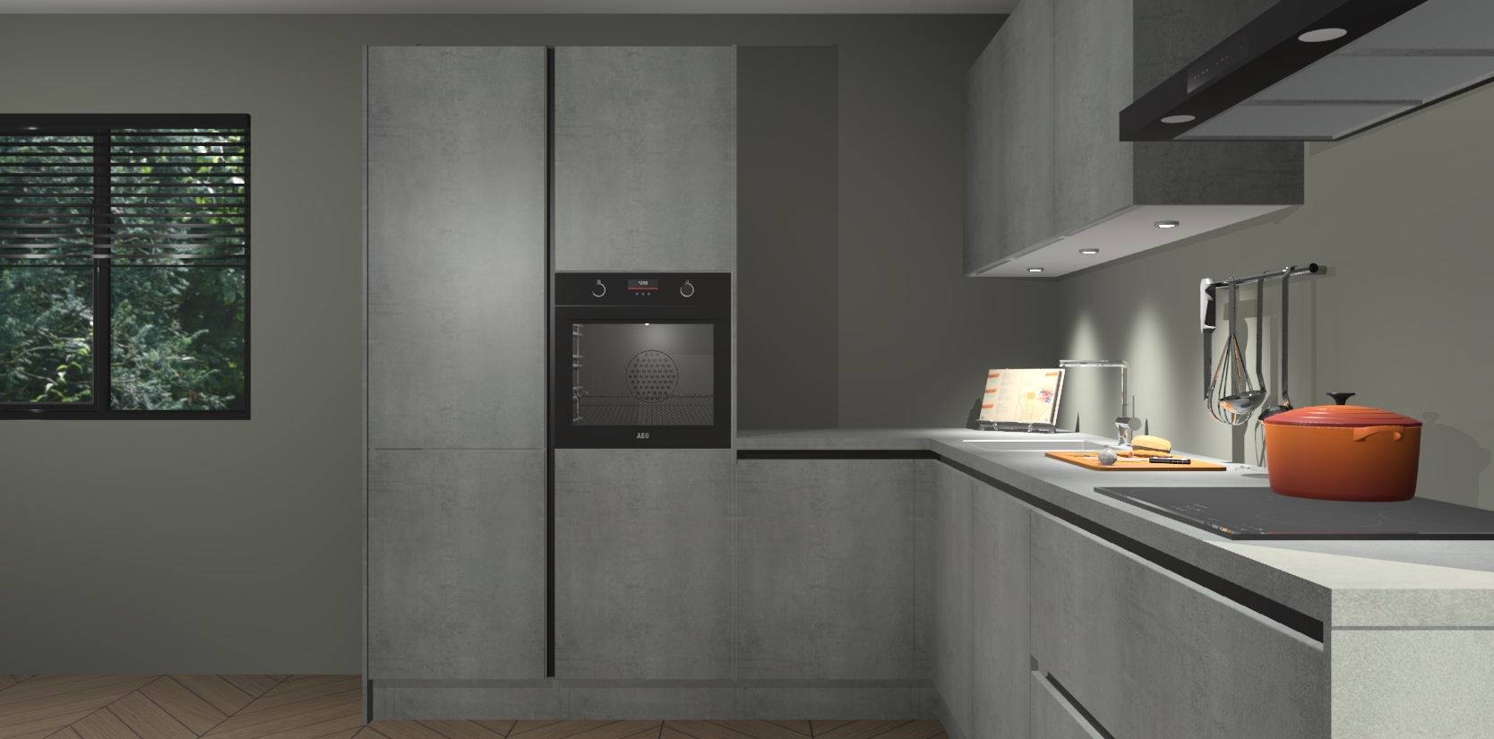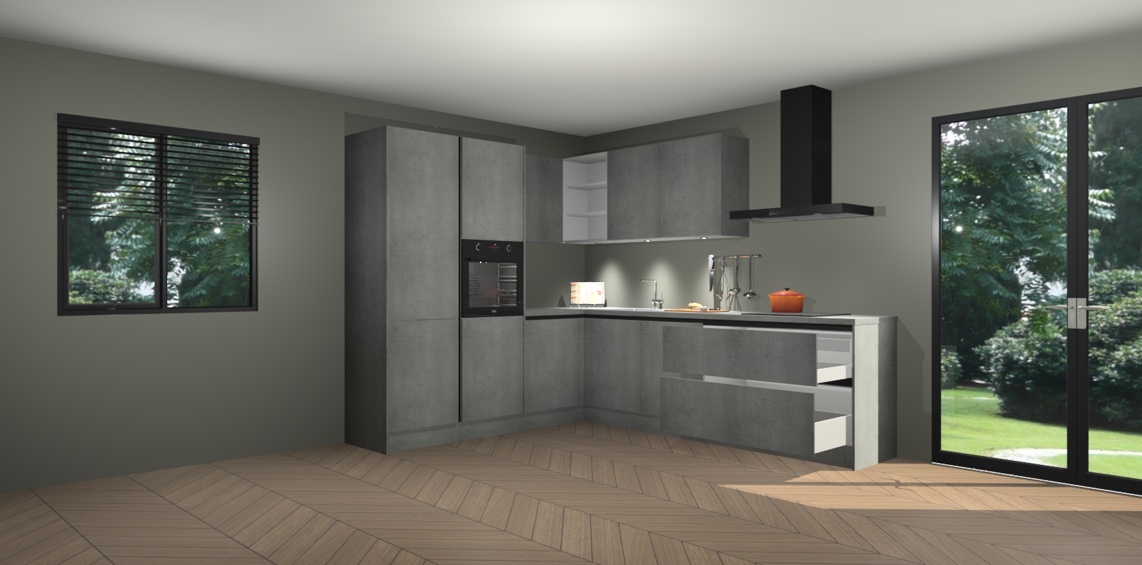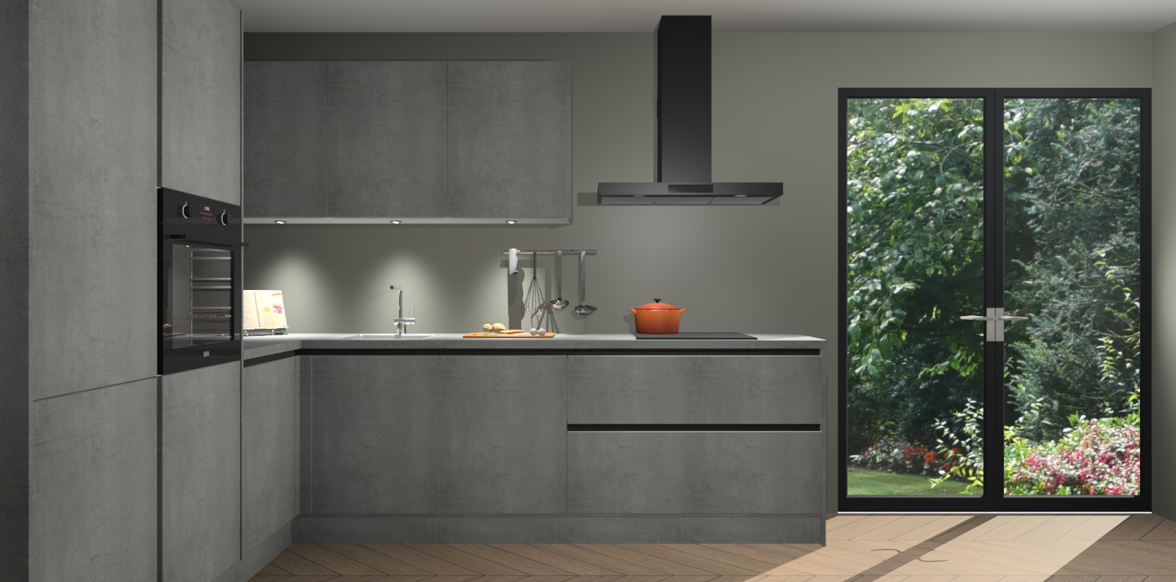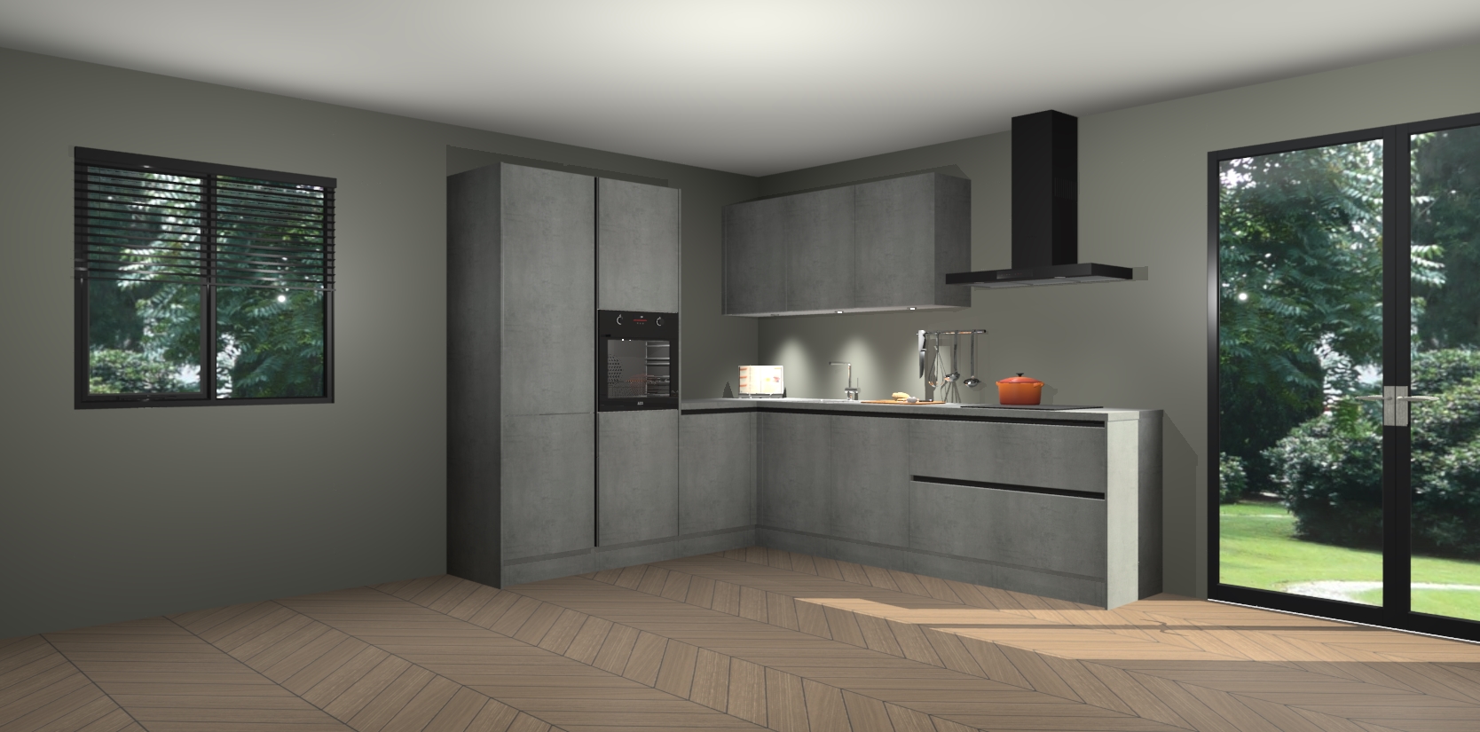 Maak kennis met de beton parelgrijs greeploze keuken Parla - de perfecte aanvulling voor uw moderne keuken! Ervaar tijdloos design, elegantie en een chique uitstraling met onze zwarte handgrepen, soft-close deuren en veel opbergruimte. Dit alles wordt aangeboden tegen een vaste lage prijs voor ongeëvenaarde Duitse keukenkwaliteit!