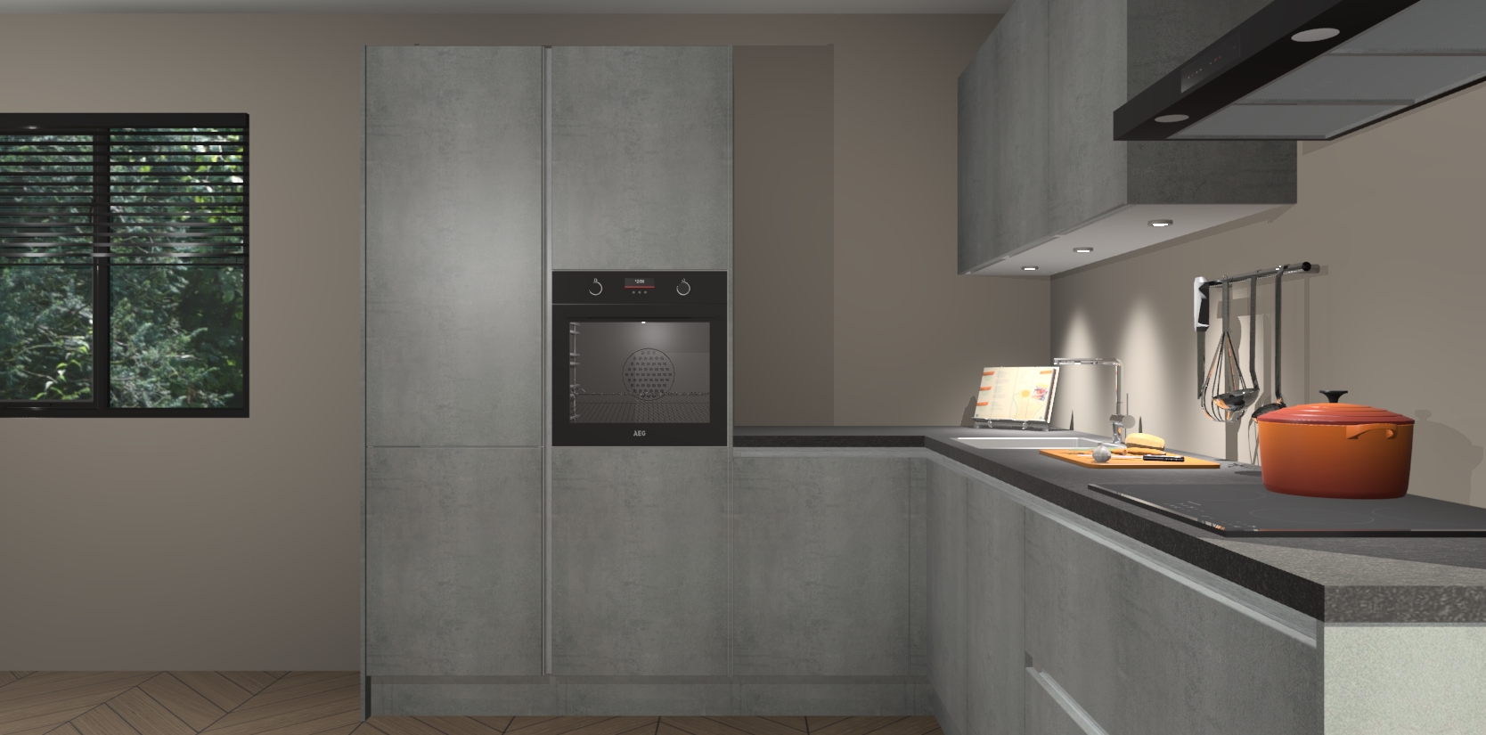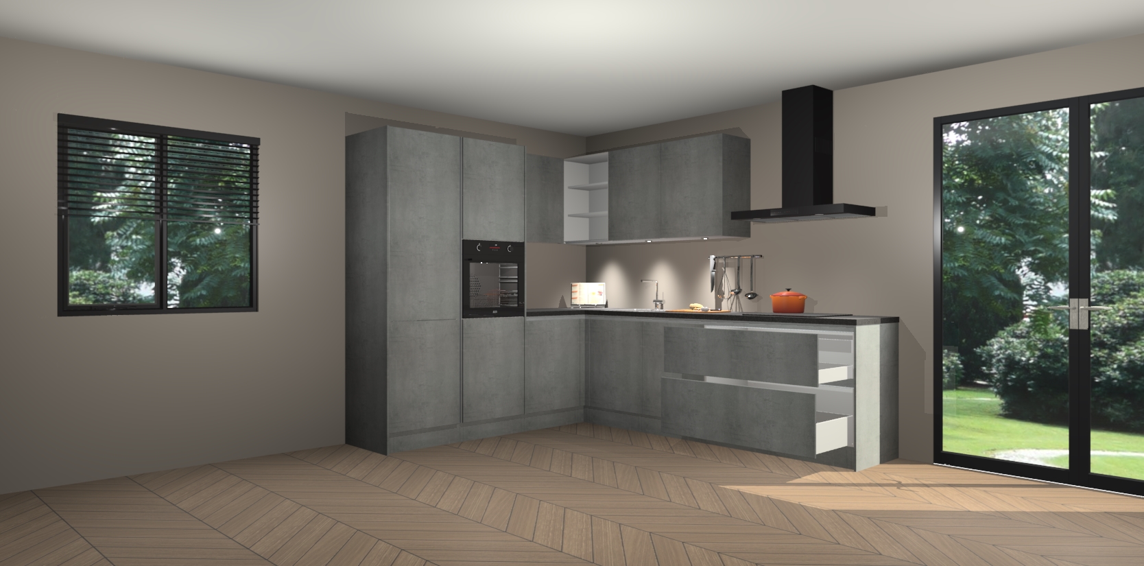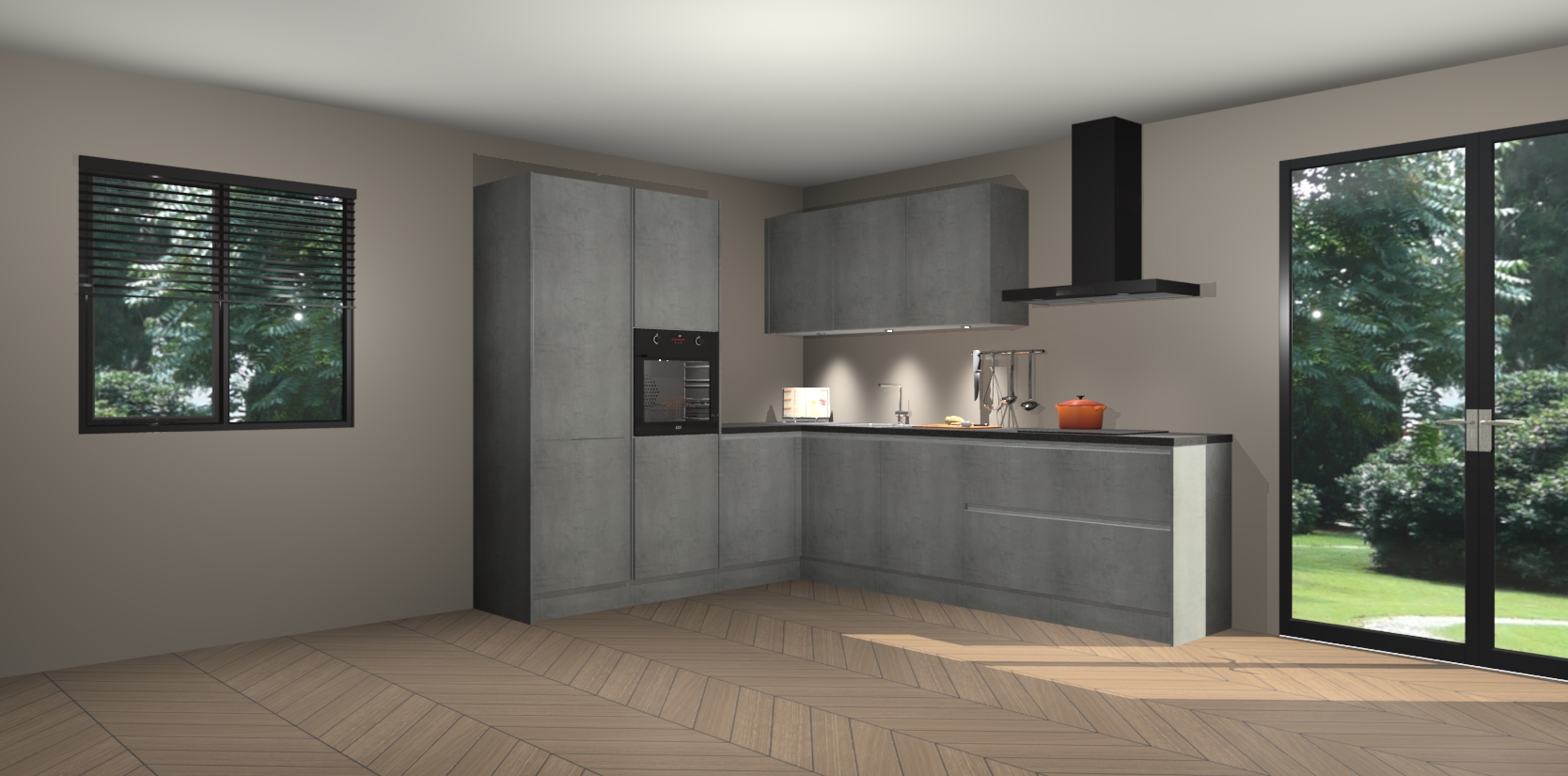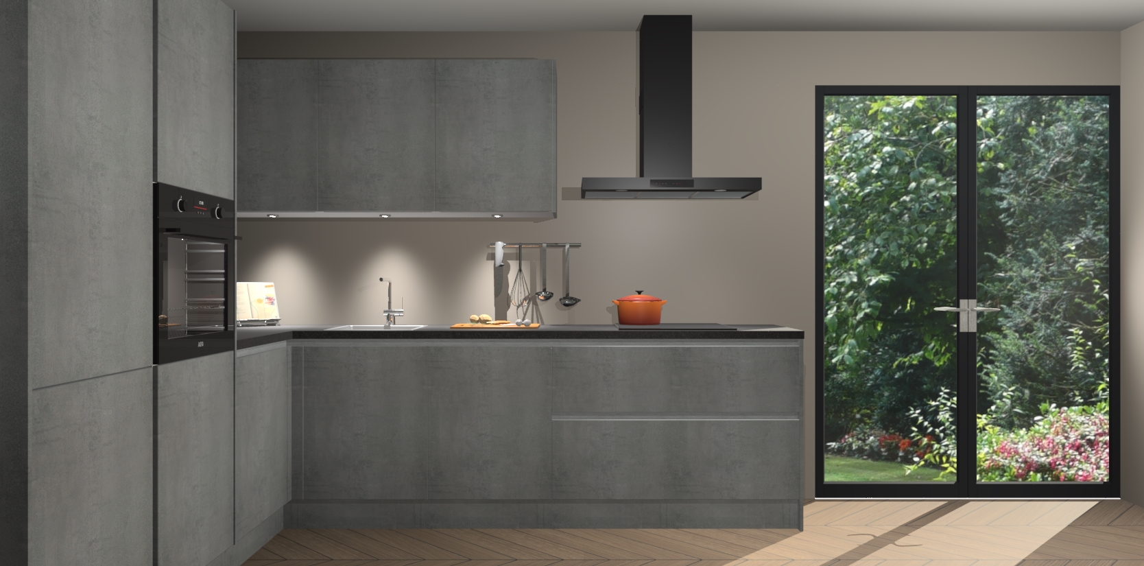 Maak kennis met de beton parelgrijs greeploze keuken Parla - de perfecte aanvulling voor uw moderne keuken! Ervaar tijdloos design, elegantie en een chique uitstraling met onze zwarte handgrepen, soft-close deuren en veel opbergruimte. Dit alles wordt aangeboden tegen een vaste lage prijs voor ongeëvenaarde Duitse keukenkwaliteit!