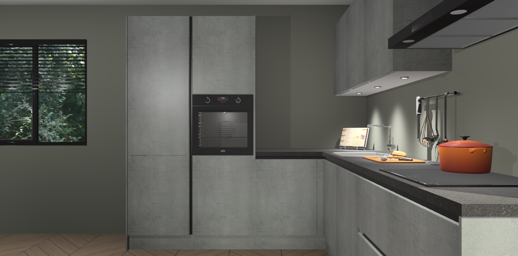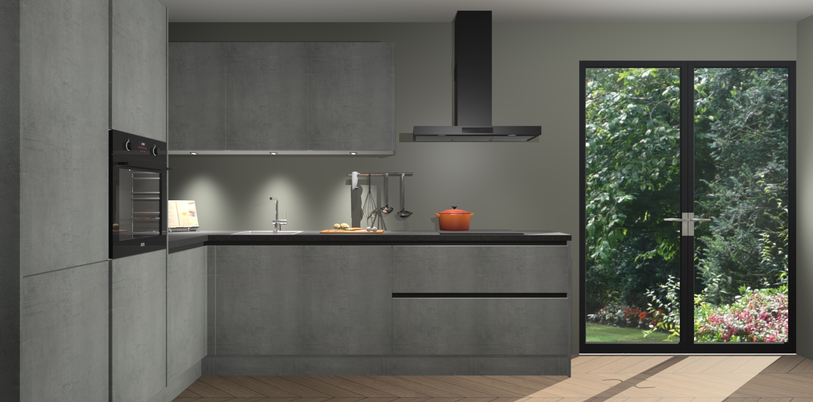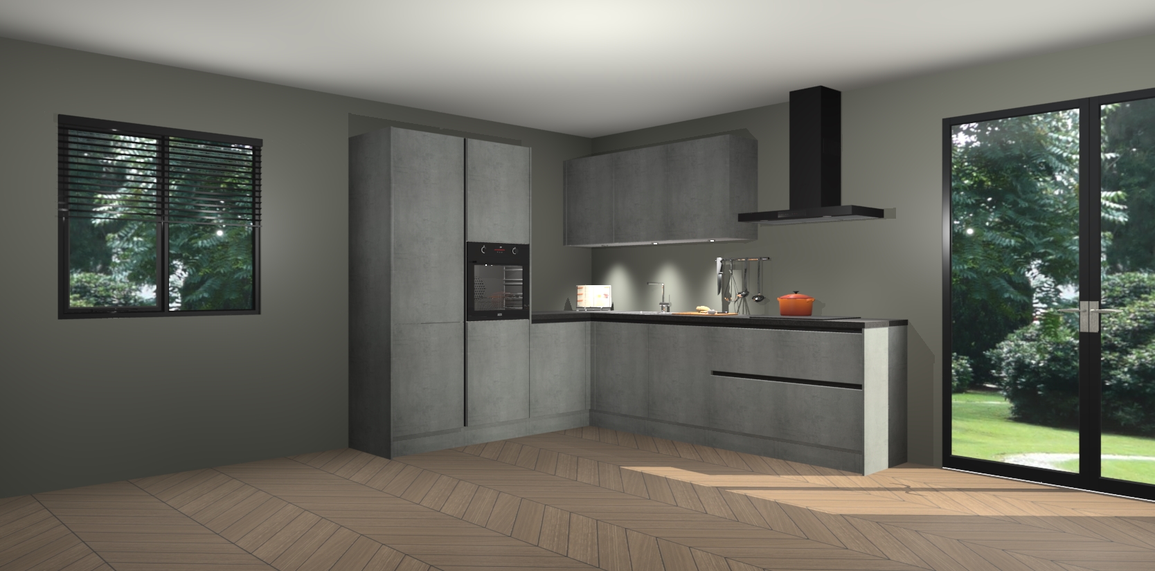 Maak kennis met de beton parelgrijs greeploze keuken Parla - de perfecte aanvulling voor uw moderne keuken! Ervaar tijdloos design, elegantie en een chique uitstraling met onze zwarte handgrepen, soft-close deuren en veel opbergruimte. Dit alles wordt aangeboden tegen een vaste lage prijs voor ongeëvenaarde Duitse keukenkwaliteit!