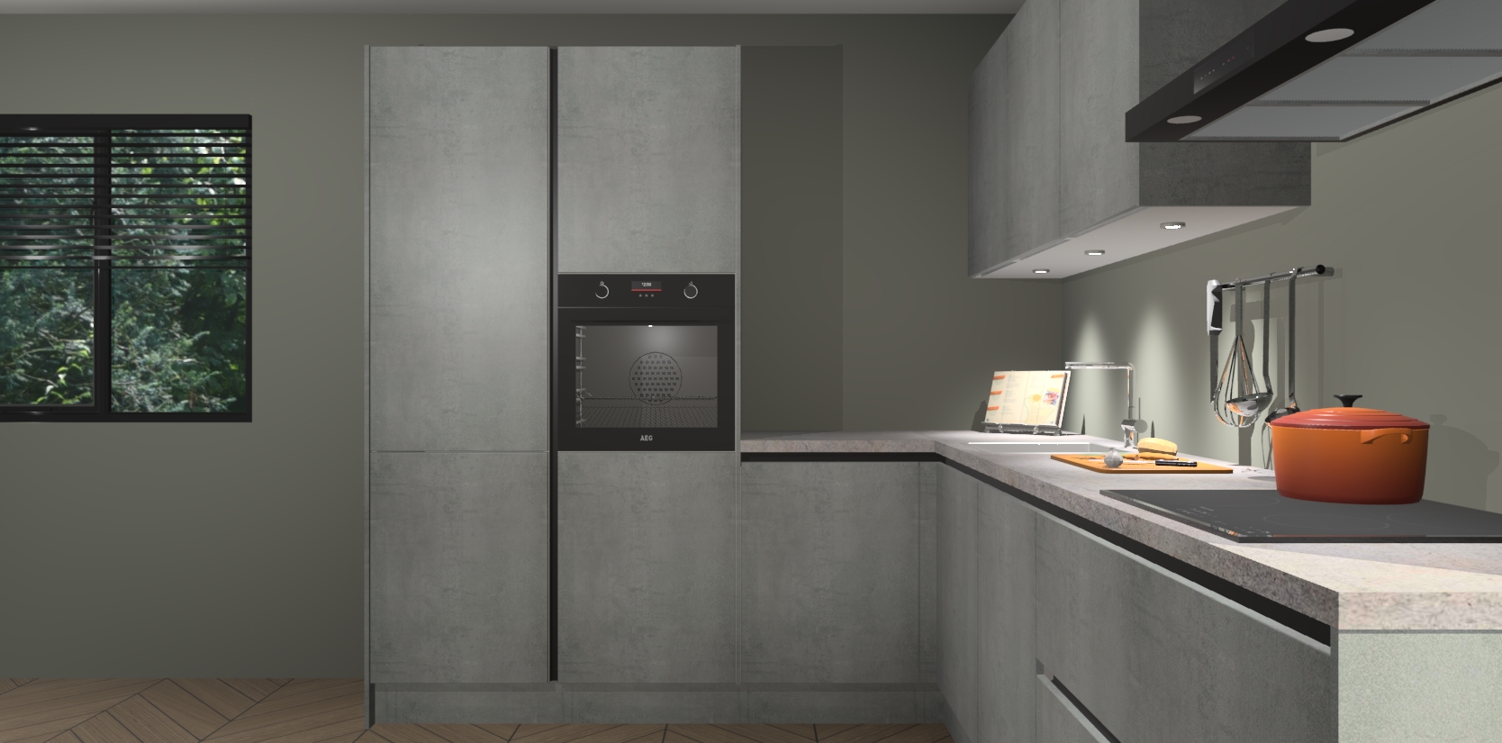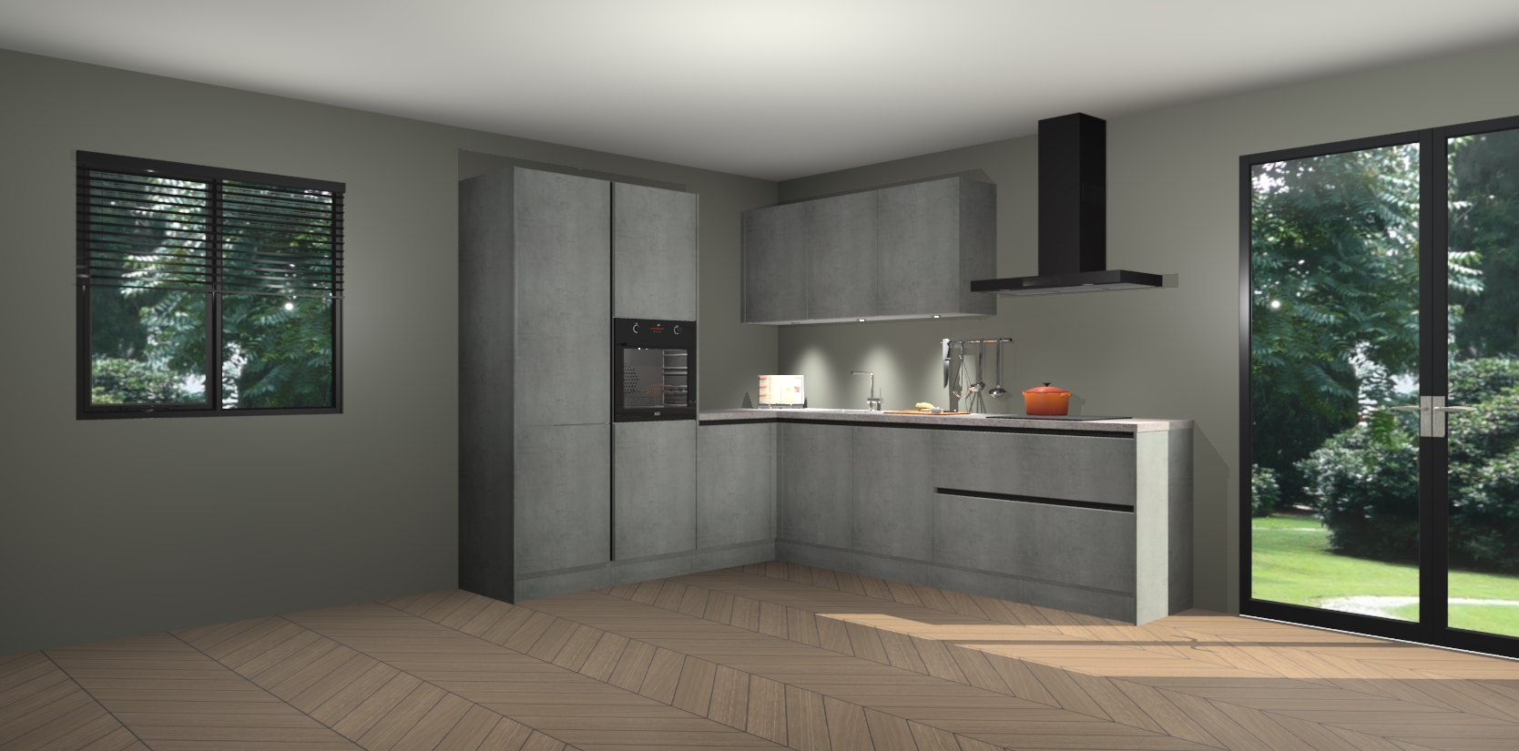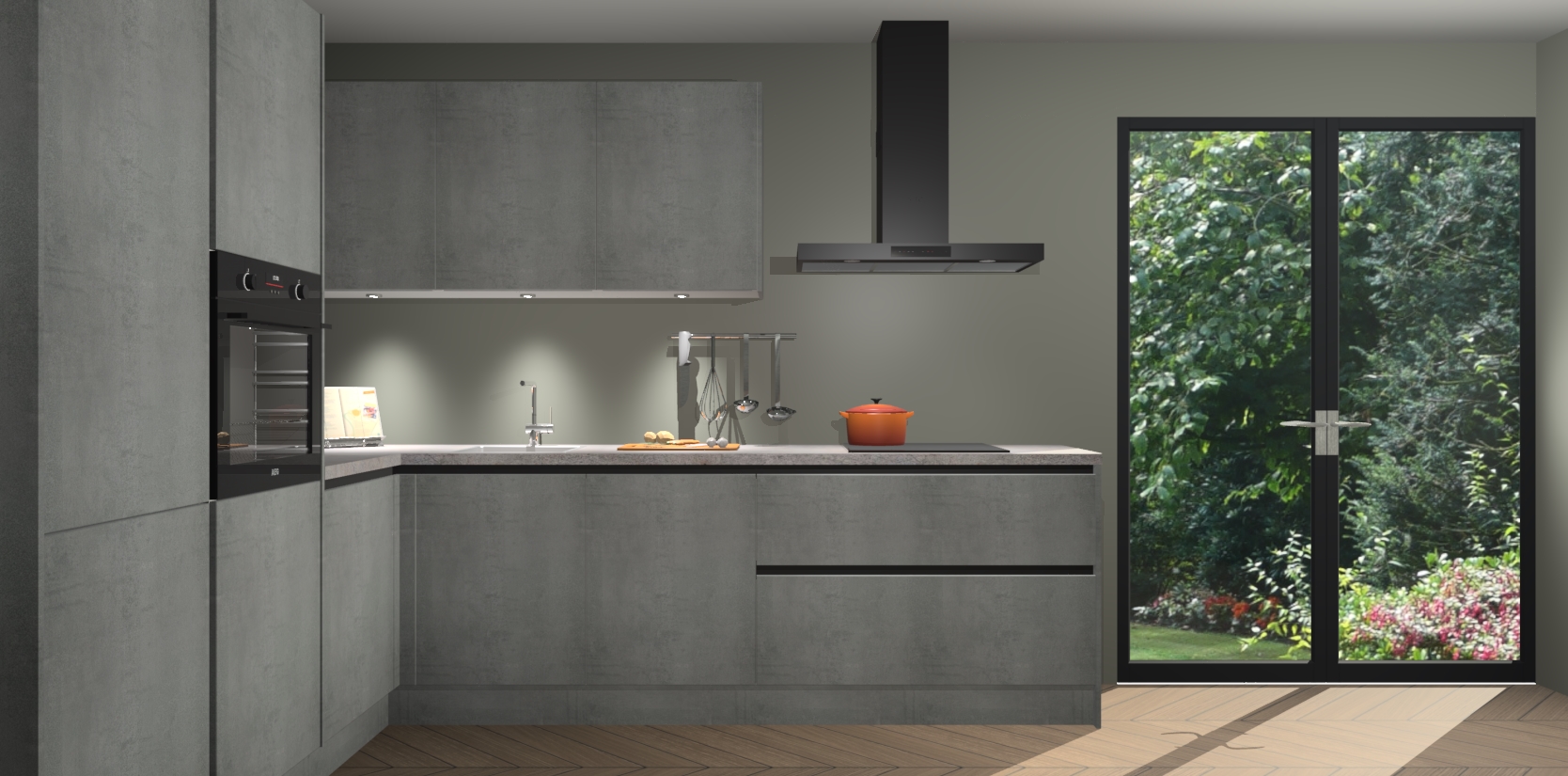 Maak kennis met de beton parelgrijs greeploze keuken Parla - de perfecte aanvulling voor uw moderne keuken! Ervaar tijdloos design, elegantie en een chique uitstraling met onze zwarte handgrepen, soft-close deuren en veel opbergruimte. Dit alles wordt aangeboden tegen een vaste lage prijs voor ongeëvenaarde Duitse keukenkwaliteit!