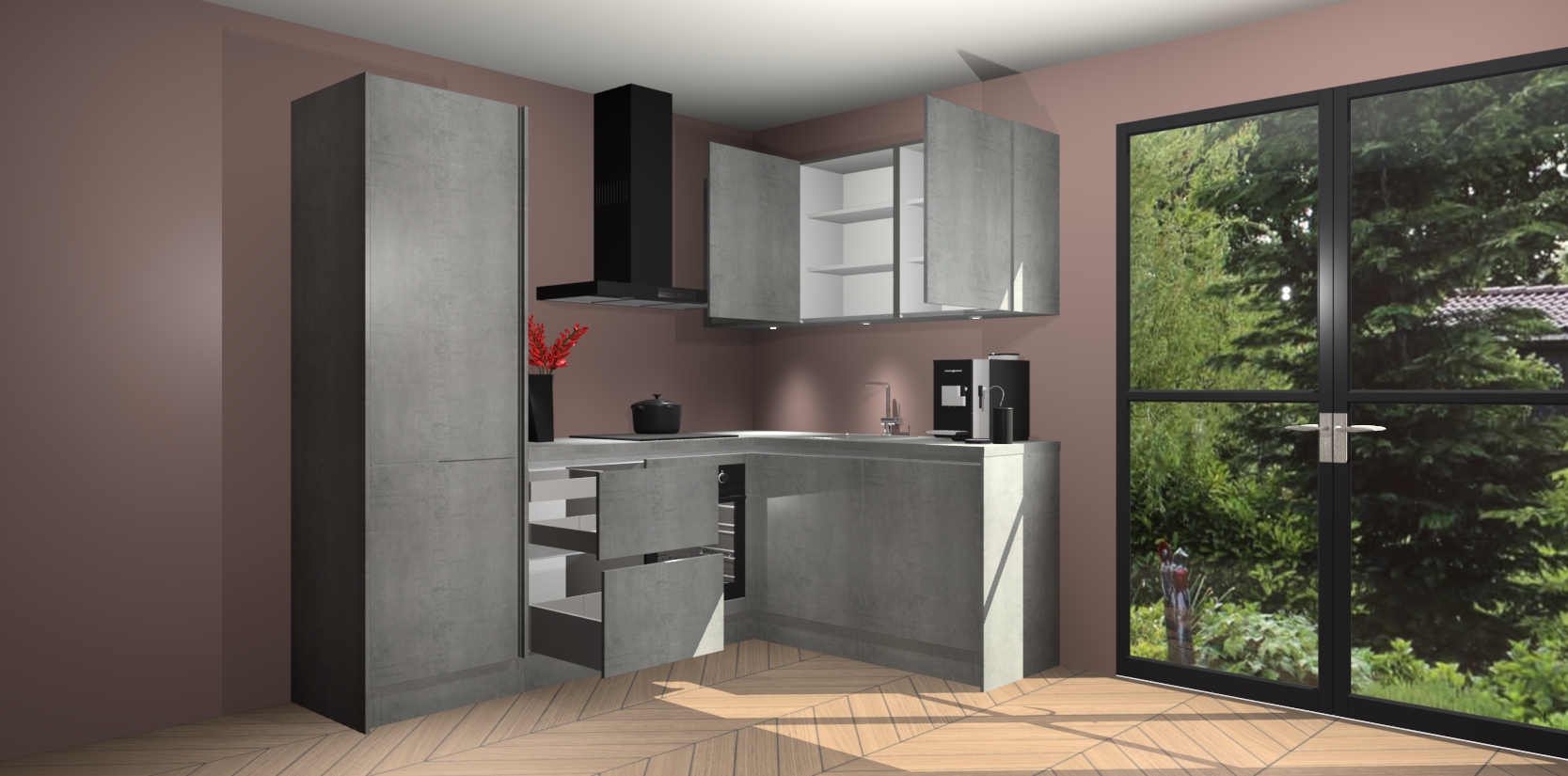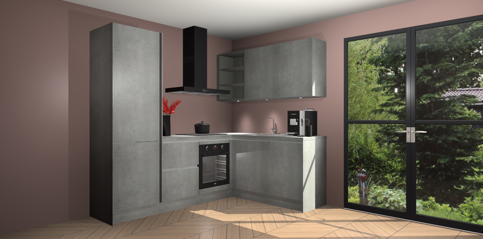Wauw, dit is de Beton Parelgrijs greeploze keuken Pilsen! U kunt gerust zeggen dat u elegantie combineert met functionaliteit met deze keuken. Met een modern en chique ontwerp is de keuken precies wat u nodig heeft om uw ruimte te verfraaien. De binnenzijde van de kasten is in dezelfde donkere kleur als de buitenzijde voor een uniforme look, compleet met softclose-kasten die stil sluiten.
