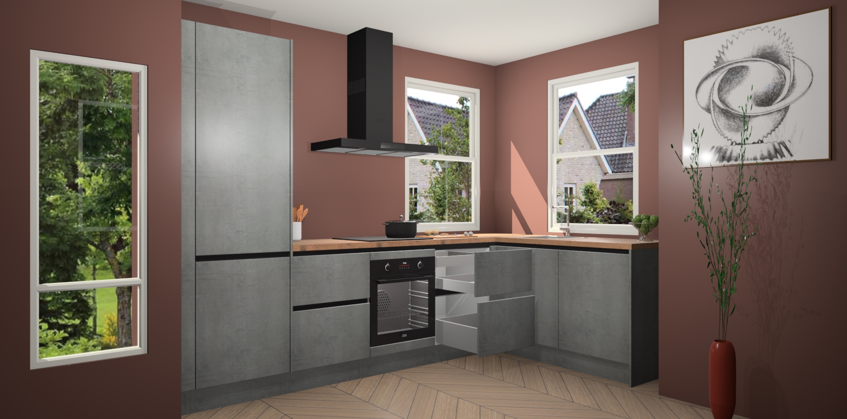 Wat maakt deze keuken zo bijzonder? Ten eerste geeft het houten werkblad uw ruimte een onmiskenbaar klassieke uitstraling. De natuurlijke afwerking roept warmte en elegantie op die nooit uit de mode zullen raken. Bovendien is het gemakkelijk schoon te houden en te onderhouden, zodat je er jarenlang plezier van kunt hebben. Als u op zoek bent naar extra gemak in uw keuken, dan heeft u bij het plaatsen van een bestelling bij ons ook de optie om uw toestellen te upgraden naar AEG-modellen - zo haalt u moderne innovatie van topmerken in apparatentechnologie rechtstreeks in huis.