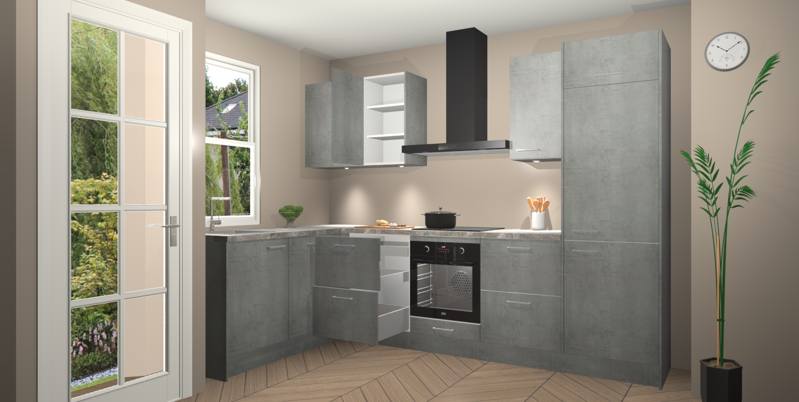 Bent u op zoek naar een strakke, moderne hoekkeuken die uw huis oppept en een moderne uitstraling geeft? Kijk dan niet verder dan de beton parelgrijs keuken Beijing. Deze verbluffende hoekkeuken tilt hedendaags design naar een hoger niveau. Qua stijl is deze chique hoekkeuken voorzien van beton parelgrijs accenten, om een strakke maar opvallende look te creëren. De binnenkant van de kasten is afgewerkt in dezelfde prachtige beton parelgrijs kleur voor extra esthetische aantrekkingskracht.