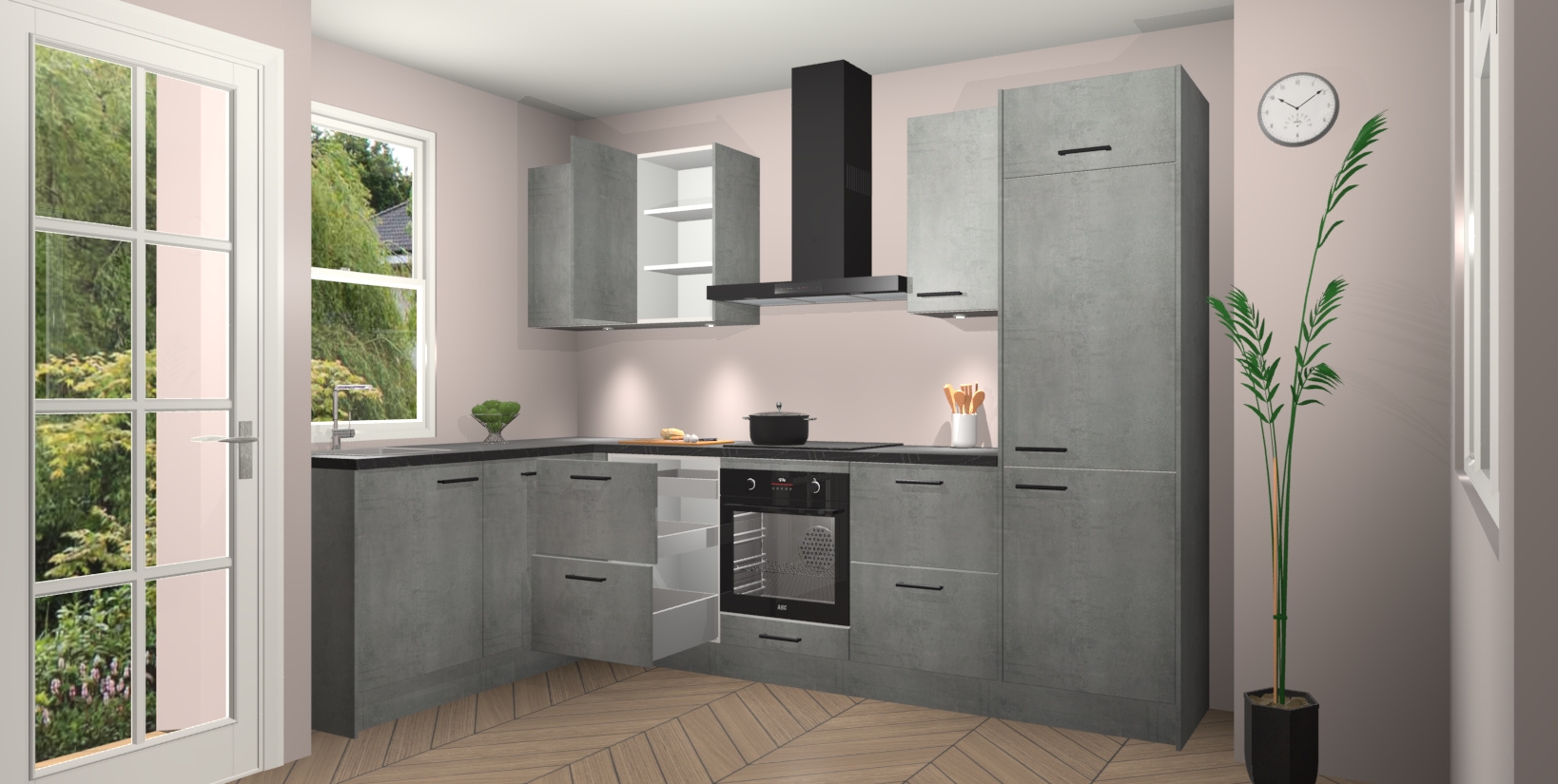 Bent u op zoek naar een strakke, moderne hoekkeuken die uw huis oppept en een moderne uitstraling geeft? Kijk dan niet verder dan de beton parelgrijs keuken Beijing. Deze verbluffende hoekkeuken tilt hedendaags design naar een hoger niveau. Qua stijl is deze chique hoekkeuken voorzien van beton parelgrijs accenten, om een strakke maar opvallende look te creëren. De binnenkant van de kasten is afgewerkt in dezelfde prachtige beton parelgrijs kleur voor extra esthetische aantrekkingskracht.