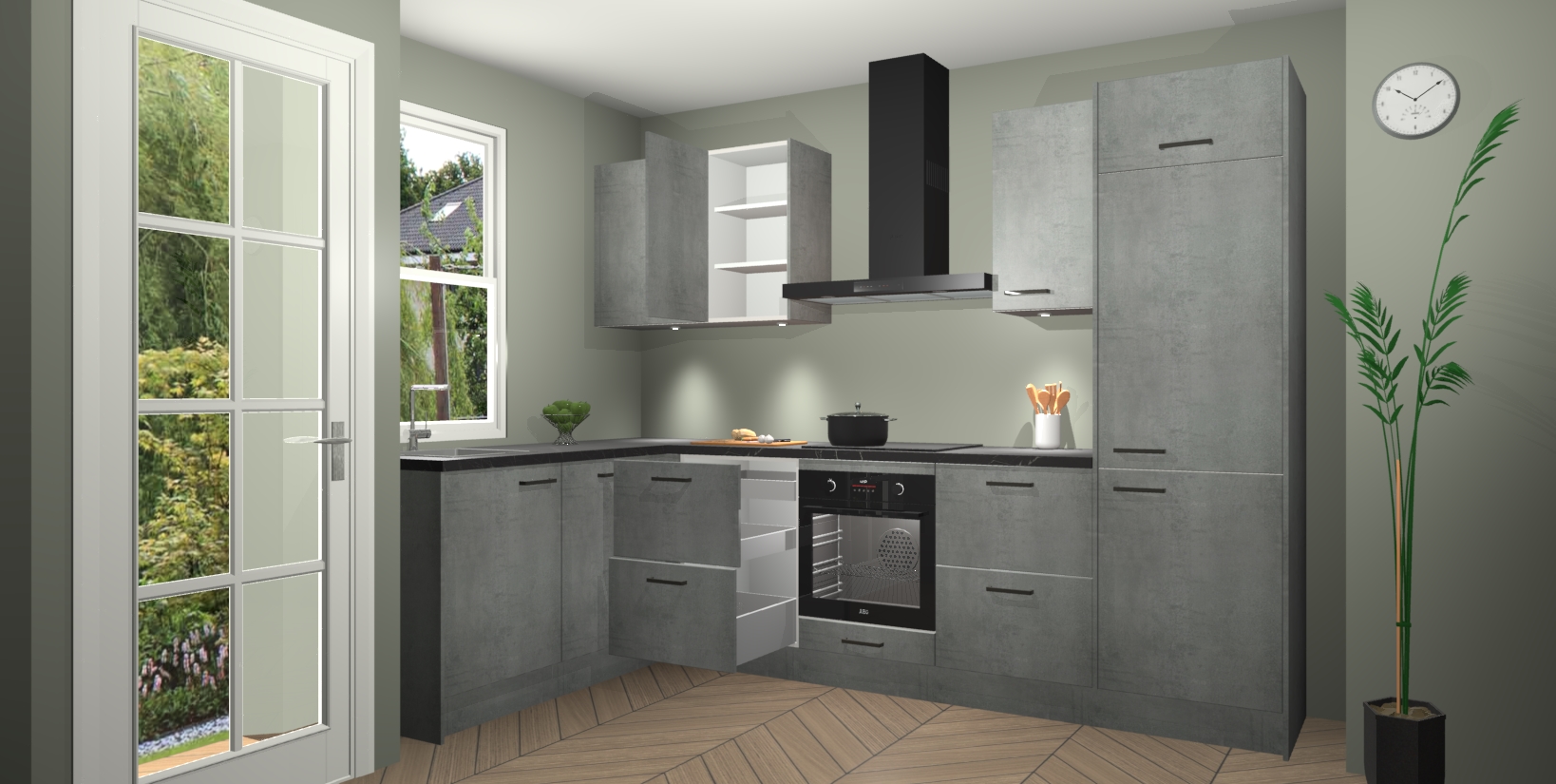 Bent u op zoek naar een strakke, moderne hoekkeuken die uw huis oppept en een moderne uitstraling geeft? Kijk dan niet verder dan de beton parelgrijs keuken Beijing. Deze verbluffende hoekkeuken tilt hedendaags design naar een hoger niveau. Qua stijl is deze chique hoekkeuken voorzien van beton parelgrijs accenten, om een strakke maar opvallende look te creëren. De binnenkant van de kasten is afgewerkt in dezelfde prachtige beton parelgrijs kleur voor extra esthetische aantrekkingskracht.