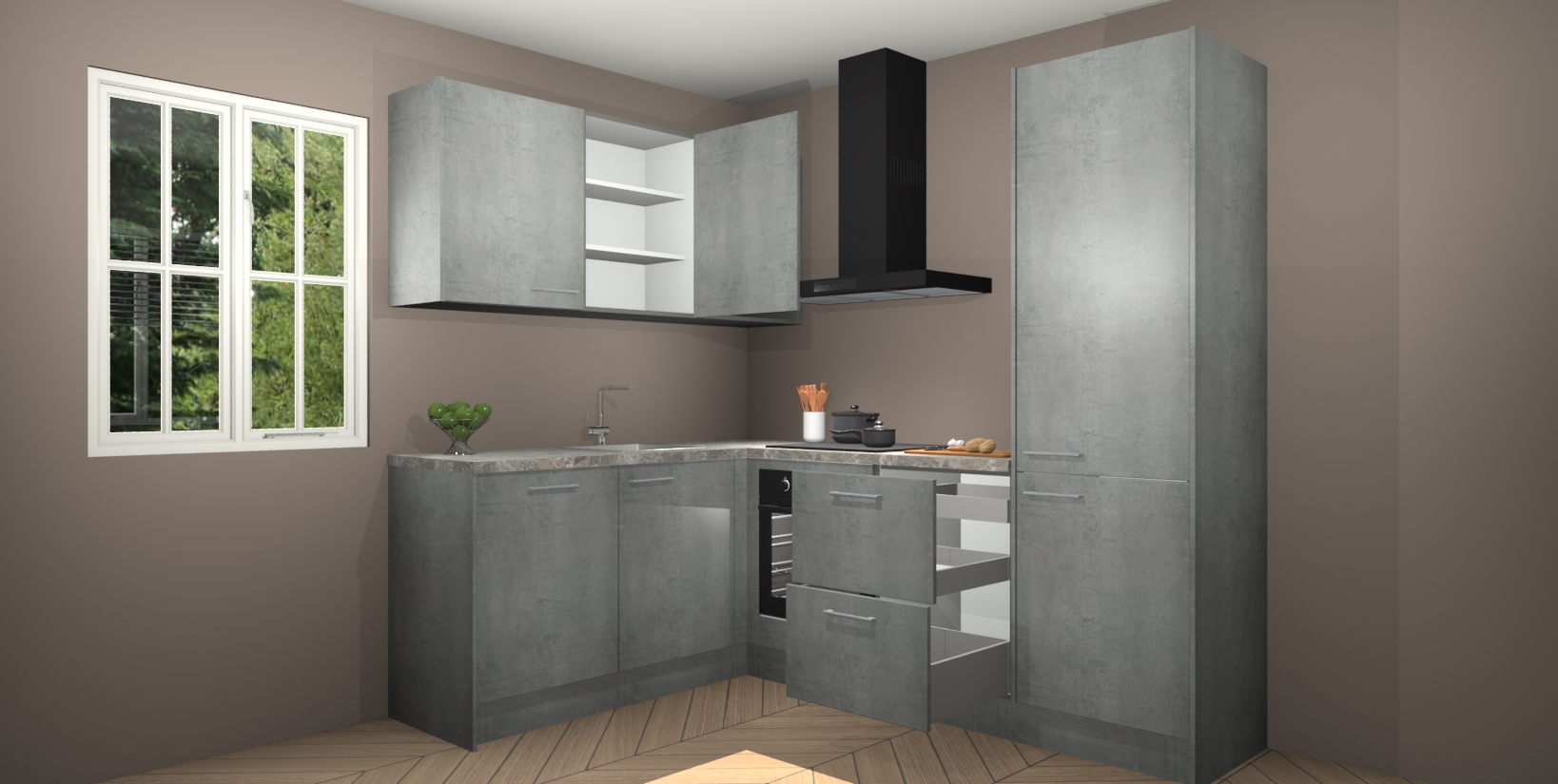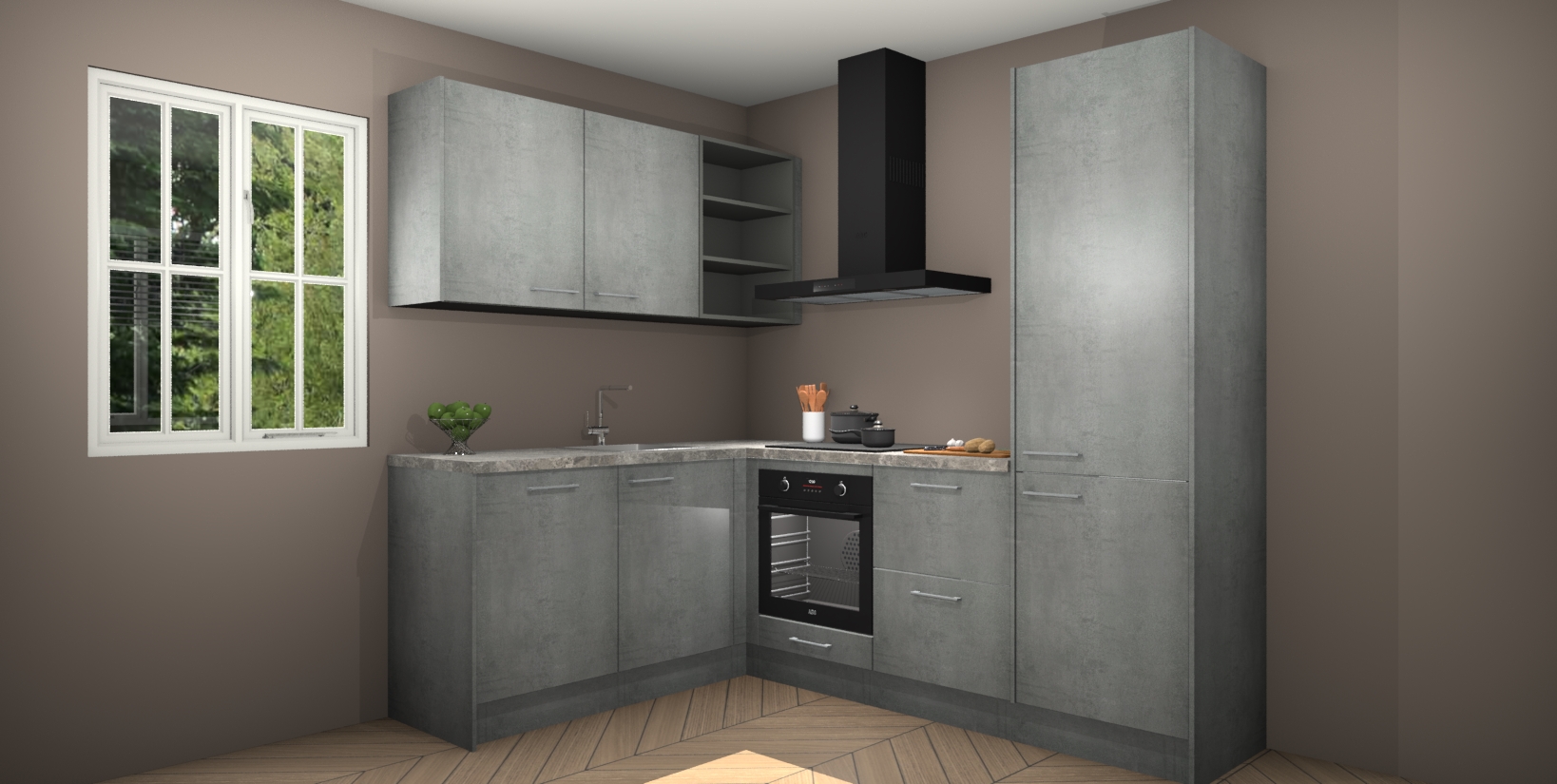 Maak kennis met de Beton Parelgrijs keuken Boekarest, een moderne hoekkeuken waar al uw vrienden en familie jaloers op zullen zijn! Het verbluffende mooie ontwerp past in elk interieur en is een ideale keuze voor wie op zoek is naar een klassieke, maar verfijnde look.