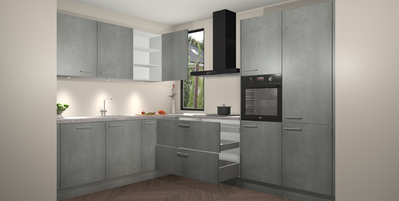 De ruime opbergruimte van dit model maakt het bereiden van voedsel en het gebruik van apparaten snel en gemakkelijk. Het beste van alles is dat het wordt geleverd met vijf inbouwapparaten: een oven, inductiekookplaat, afzuigkap, vaatwasser en koelkast - die allemaal gemakkelijk kunnen worden opgewaardeerd naar AEG na aankoop. Wat de gemaksfactor nog groter maakt, is het feit dat alle cabines voorgemonteerd worden geleverd, zodat u er meteen mee aan de slag kunt!