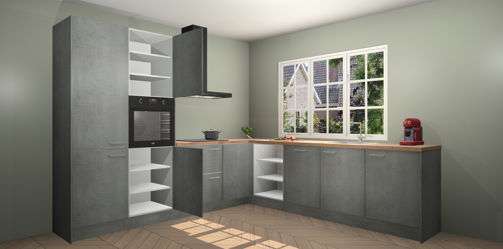 De keuken heeft veel opbergruimte, waardoor u alle ingrediënten gemakkelijk bereikbaar hebt staan. En daarnaast bevat deze volledig uitgeruste keuken ook 5 ingebouwde apparaten: een oven, inductiekookplaat, afzuigkap, vaatwasser en koelkast. Deze zijn heel eenvoudig na bestellen te upgraden naar AEG als u dit wilt. Bovendien zijn de softclose-kastdeuren ideaal; geef ze gewoon even een tikje en ze sluiten automatisch met geruisloze precisie.