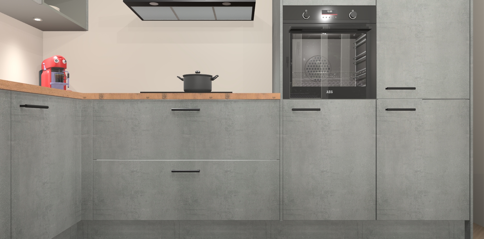 De Beton Parelgrijs keuken Cognac is een adembenemend ontwerp met een modern en tijdloos uiterlijk. Deze luxe keuken straalt echt aristocratisch uit, waardoor uw koken plezieriger zal worden! Het prachtige design begint bij de hoekkeuken, wat perfect past bij elk type interieur. Bovendien bevat deze hoogwaardige set vijf inbouwapparaten - van oven tot koelkast - die via bestelling naar AEG geüpgraded kunnen worden!