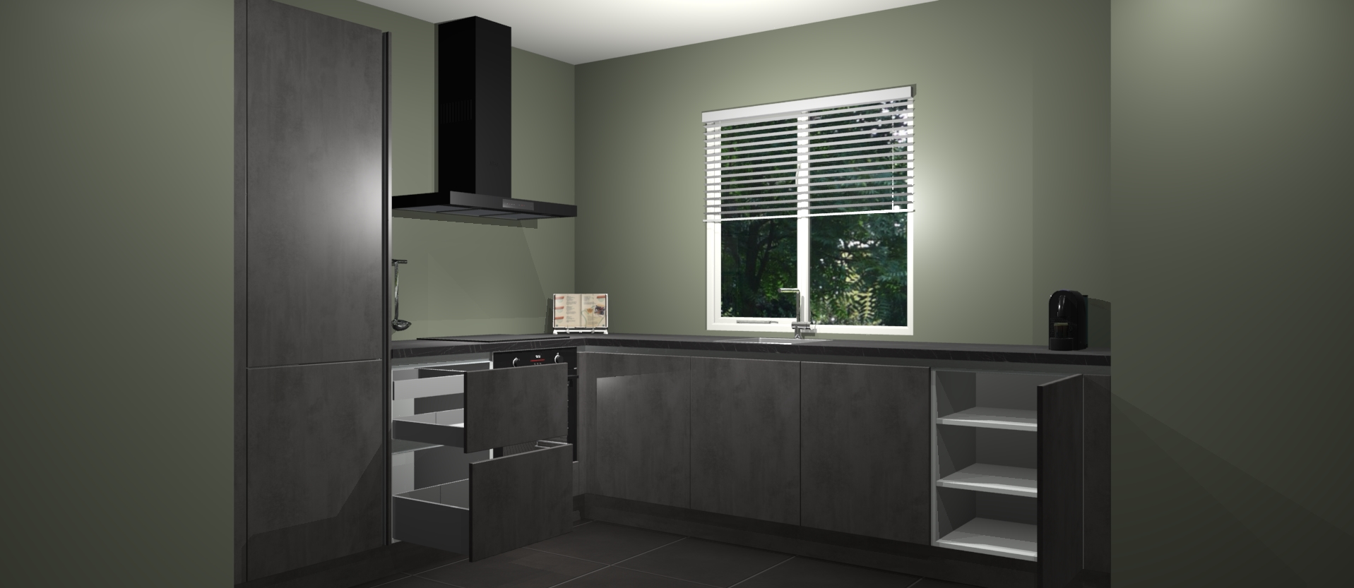 Met de Beton Antraciet keuken Doha Maakt u van uw keuken het pronkstuk van uw huis. Stijlvol en toch praktisch, de nieuwste look voor wie meer waarde en charme aan zijn huis wil toevoegen. Met prachtige zwarte handgrepen die zich lenen voor een klassieke stijlbron, zal u niet teleurgesteld zijn in het resultaat. De soft-close deurscharnieren geven een gevoel van luxe omdat ze zachtjes bewegen zonder storende of krakende geluiden te veroorzaken.