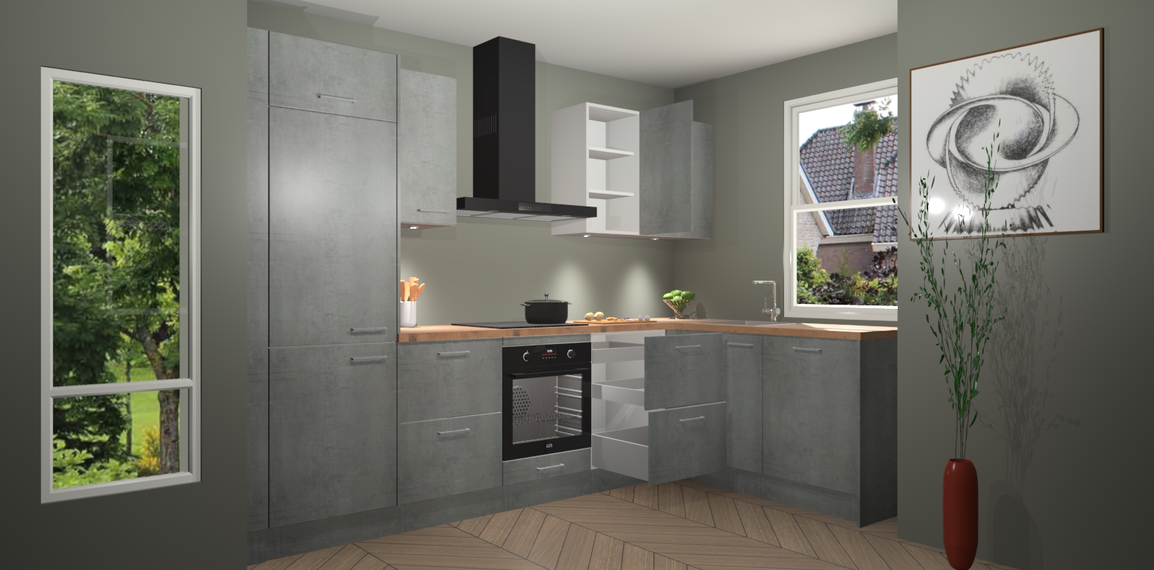 Bent u op zoek naar een moderne en tijdloze keuken die schoonheid in uw huis brengt? Zoek dan niet verder dan de Beton Parelgrijs keuken Geneve - de perfecte keuken voor al uw wensen. Deze hoekkeuken biedt de hoogste Duitse kwaliteit voor een vaste lage prijs en is zeker een blikvanger in uw huis!