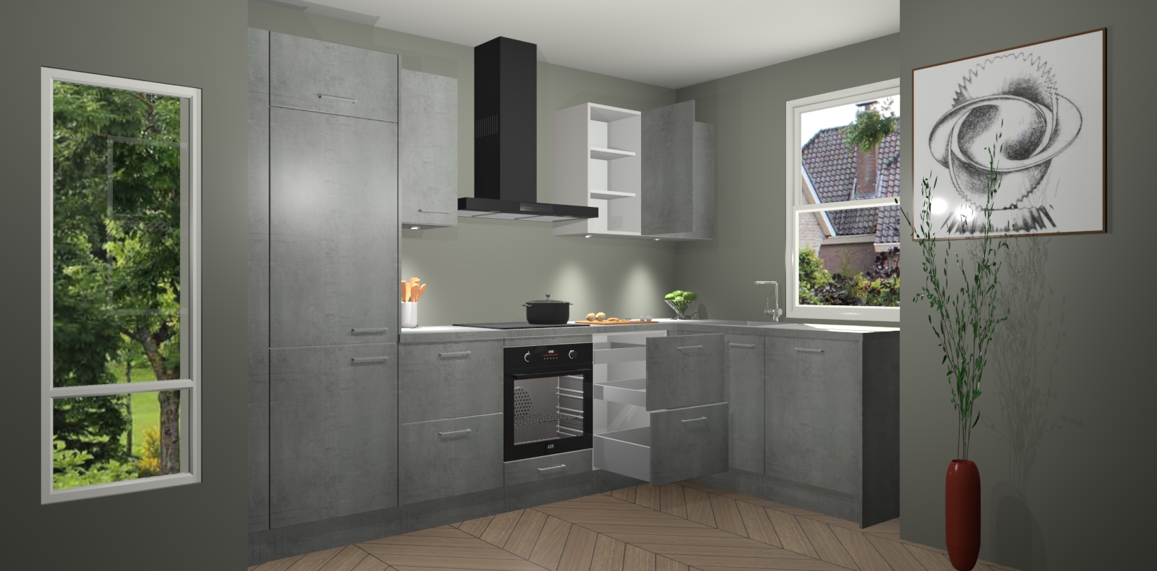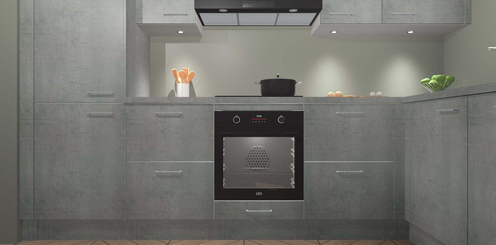 De Beton Parelgrijs keuken Geneve is uitgerust met 5 inbouwapparaten - een oven, inductiekookplaat, afzuigkap, vaatwasser en koelkast - voor al uw kook- en bewaarbehoeftes. U kunt deze apparaten desgewenst eenvoudig upgraden naar AEG of de oven omruilen voor een combimagnetron na het plaatsen van uw bestelling. En met de soft close deuren, voldoende opbergruimte en kasten die voorgemonteerd worden geleverd, bent u in een mum van tijd klaar om heerlijke maaltijden te bereiden!