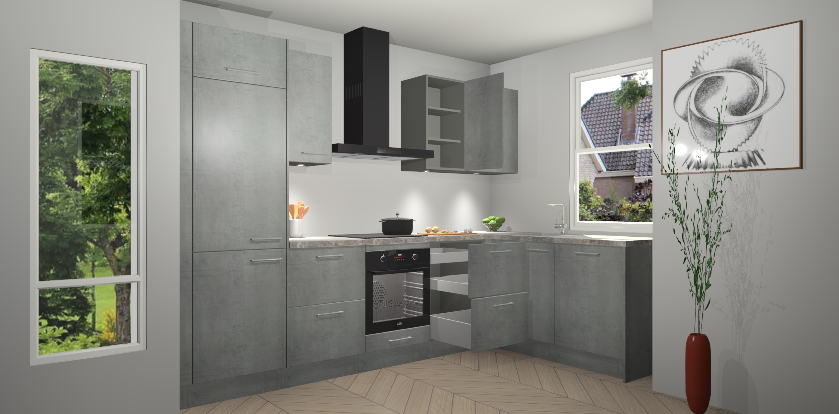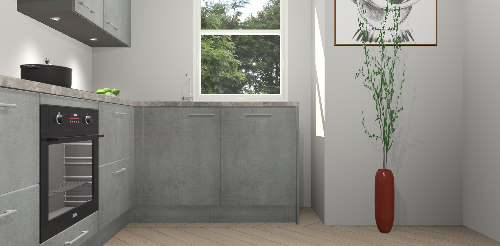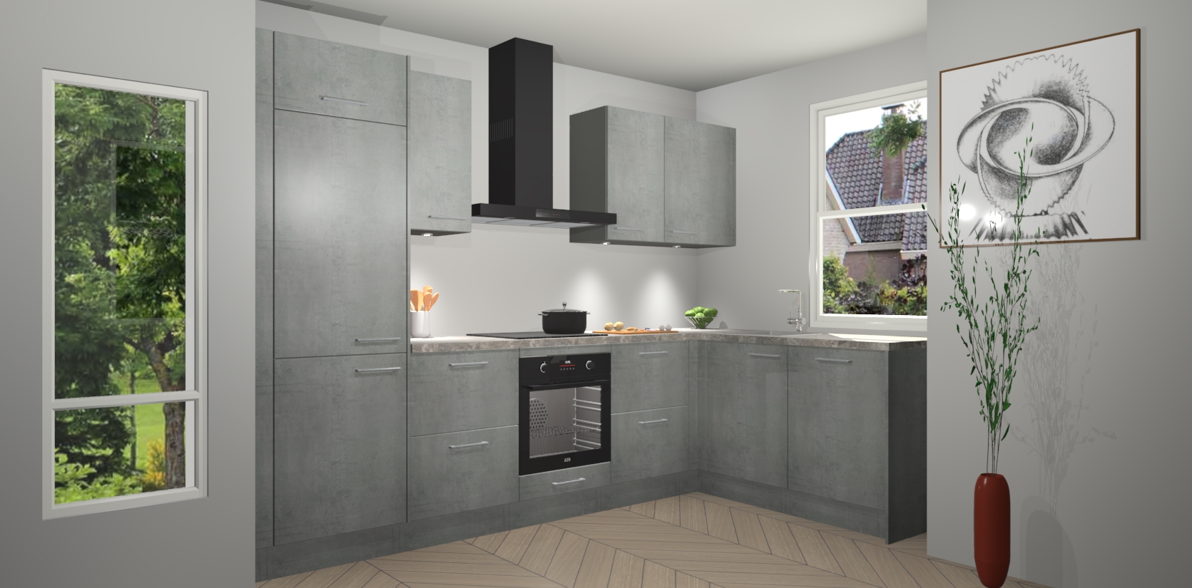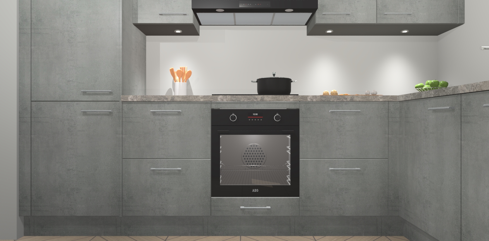 De Beton Parelgrijs keuken Geneve is uitgerust met 5 inbouwapparaten - een oven, inductiekookplaat, afzuigkap, vaatwasser en koelkast - voor al uw kook- en bewaarbehoeftes. U kunt deze apparaten desgewenst eenvoudig upgraden naar AEG of de oven omruilen voor een combimagnetron na het plaatsen van uw bestelling. En met de soft close deuren, voldoende opbergruimte en kasten die voorgemonteerd worden geleverd, bent u in een mum van tijd klaar om heerlijke maaltijden te bereiden!
