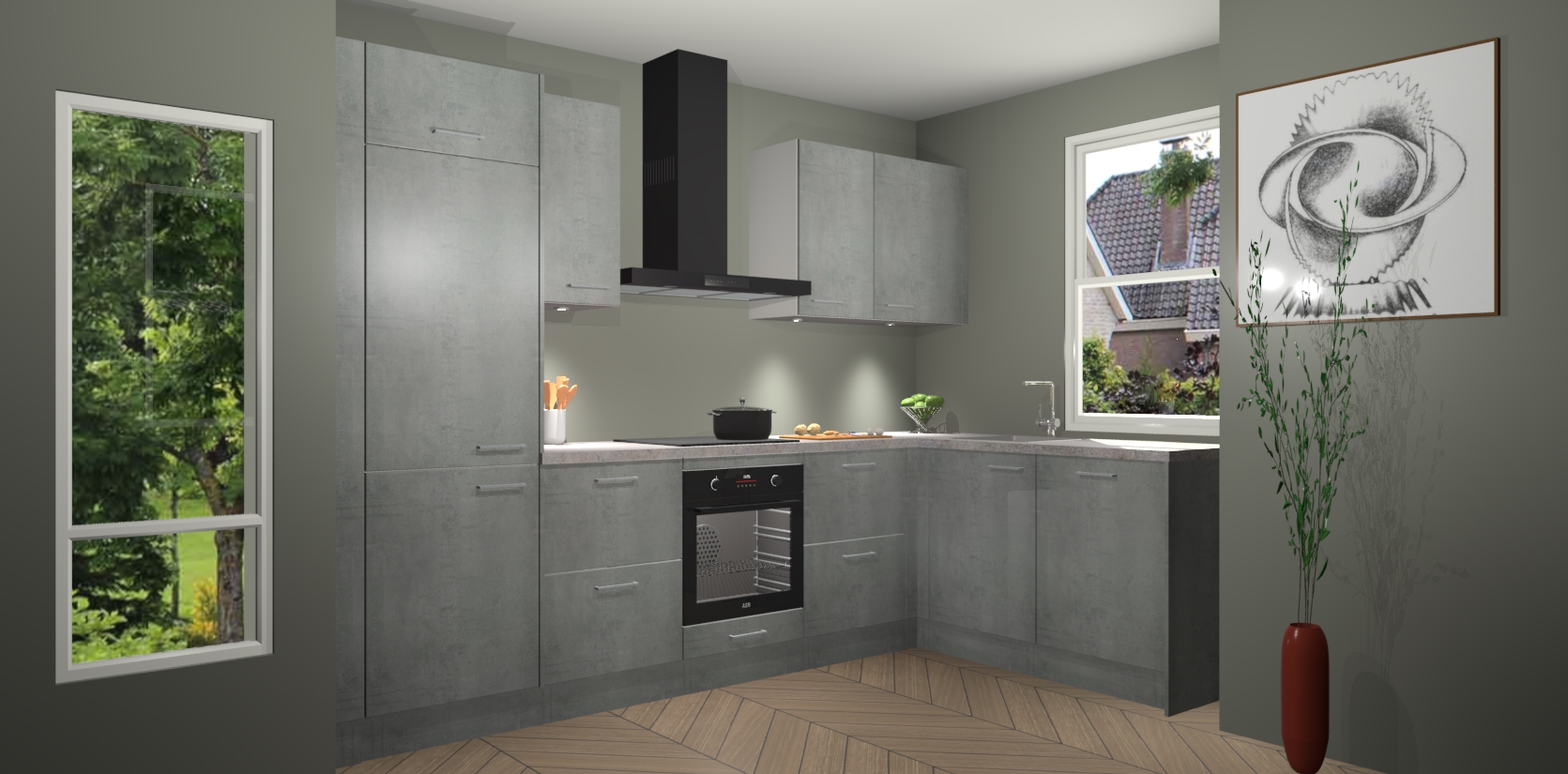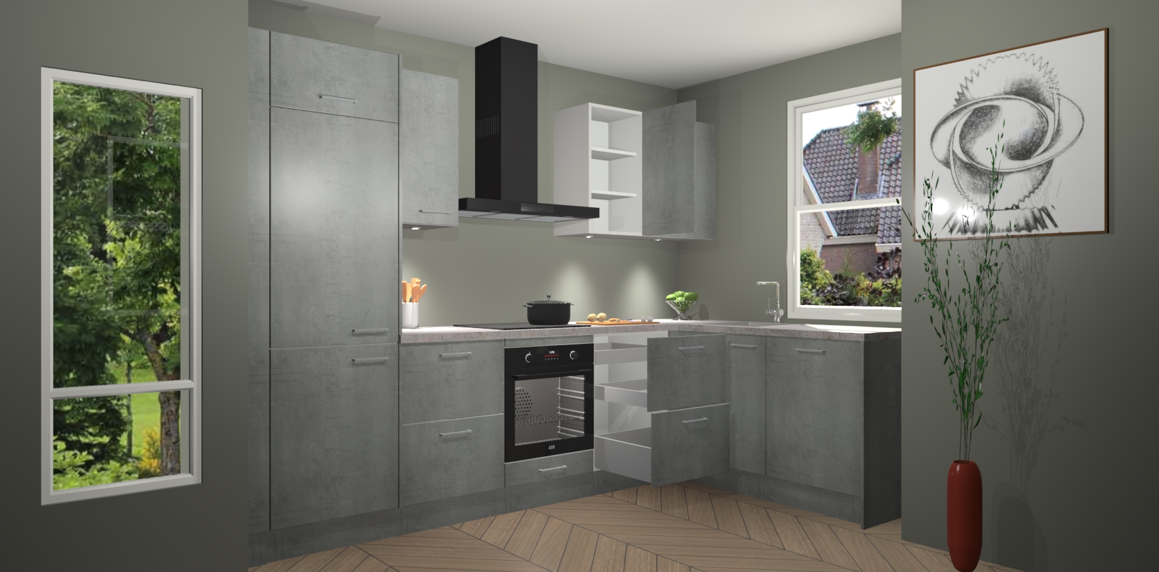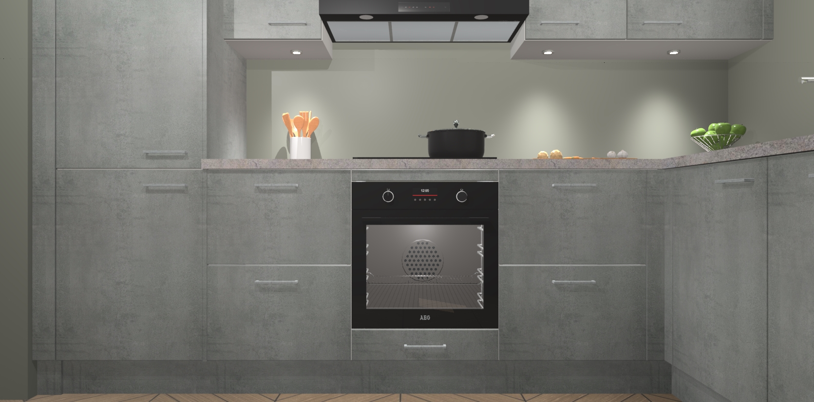 De Beton Parelgrijs keuken Geneve is uitgerust met 5 inbouwapparaten - een oven, inductiekookplaat, afzuigkap, vaatwasser en koelkast - voor al uw kook- en bewaarbehoeftes. U kunt deze apparaten desgewenst eenvoudig upgraden naar AEG of de oven omruilen voor een combimagnetron na het plaatsen van uw bestelling. En met de soft close deuren, voldoende opbergruimte en kasten die voorgemonteerd worden geleverd, bent u in een mum van tijd klaar om heerlijke maaltijden te bereiden!