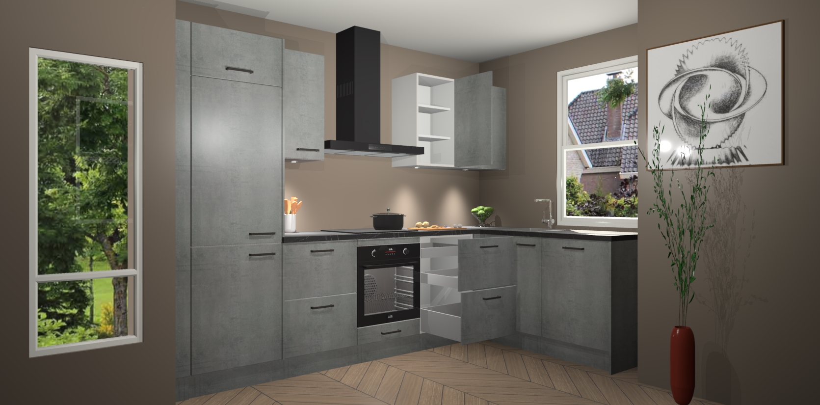 Bent u op zoek naar een moderne en tijdloze keuken die schoonheid in uw huis brengt? Zoek dan niet verder dan de Beton Parelgrijs keuken Geneve - de perfecte keuken voor al uw wensen. Deze hoekkeuken biedt de hoogste Duitse kwaliteit voor een vaste lage prijs en is zeker een blikvanger in uw huis!