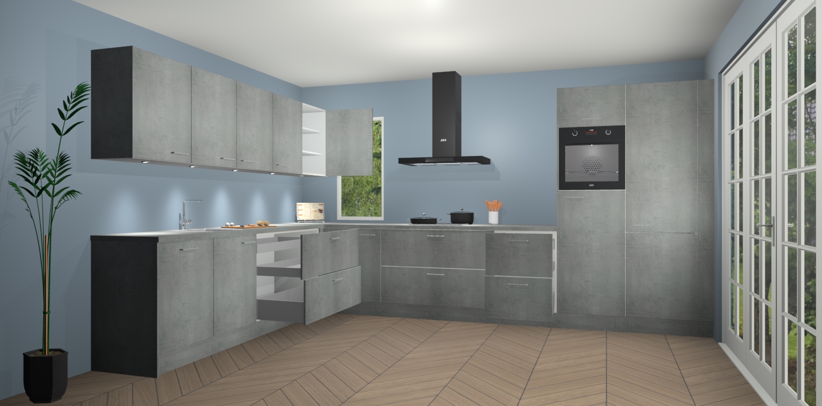 Heeft u nog apparatuur nodig? Geen probleem: de beton parelgrijs keuken Harare bevat vijf ingebouwde apparaten - een oven, inductiekookplaat, afzuigkap, vaatwasser en koelkast - die gemakkelijk kunnen worden bijgewerkt naar AEG na bestelling. En als dat nog niet genoeg is; onze kasten worden pre-geassembleerd geleverd en zijn verkrijgbaar tegen een vastgeroeste lage prijs! U hoeft nooit meer te zoeken naar goede kwaliteit en service want onze producten hebben echt Duitse kwaliteit.