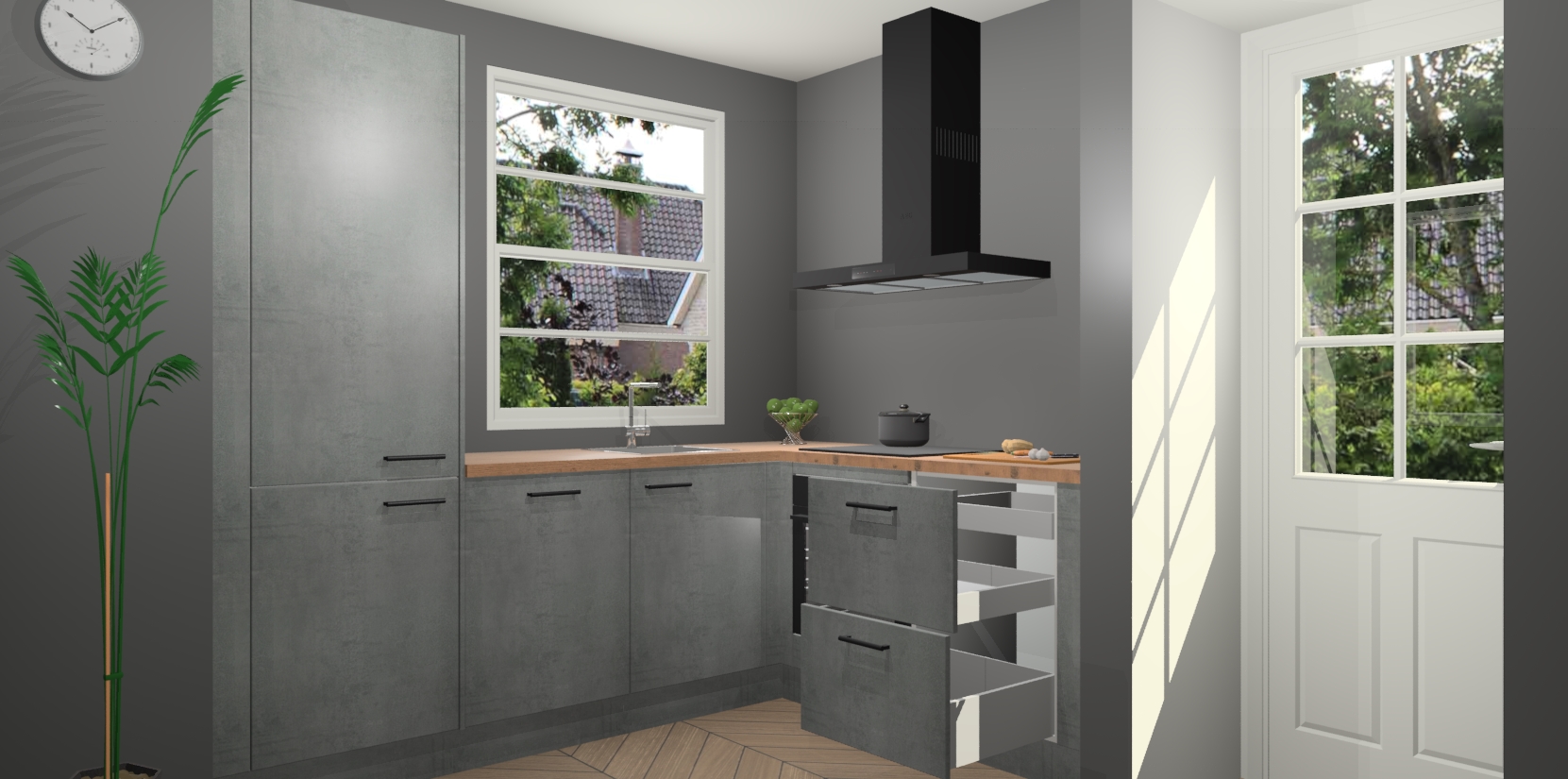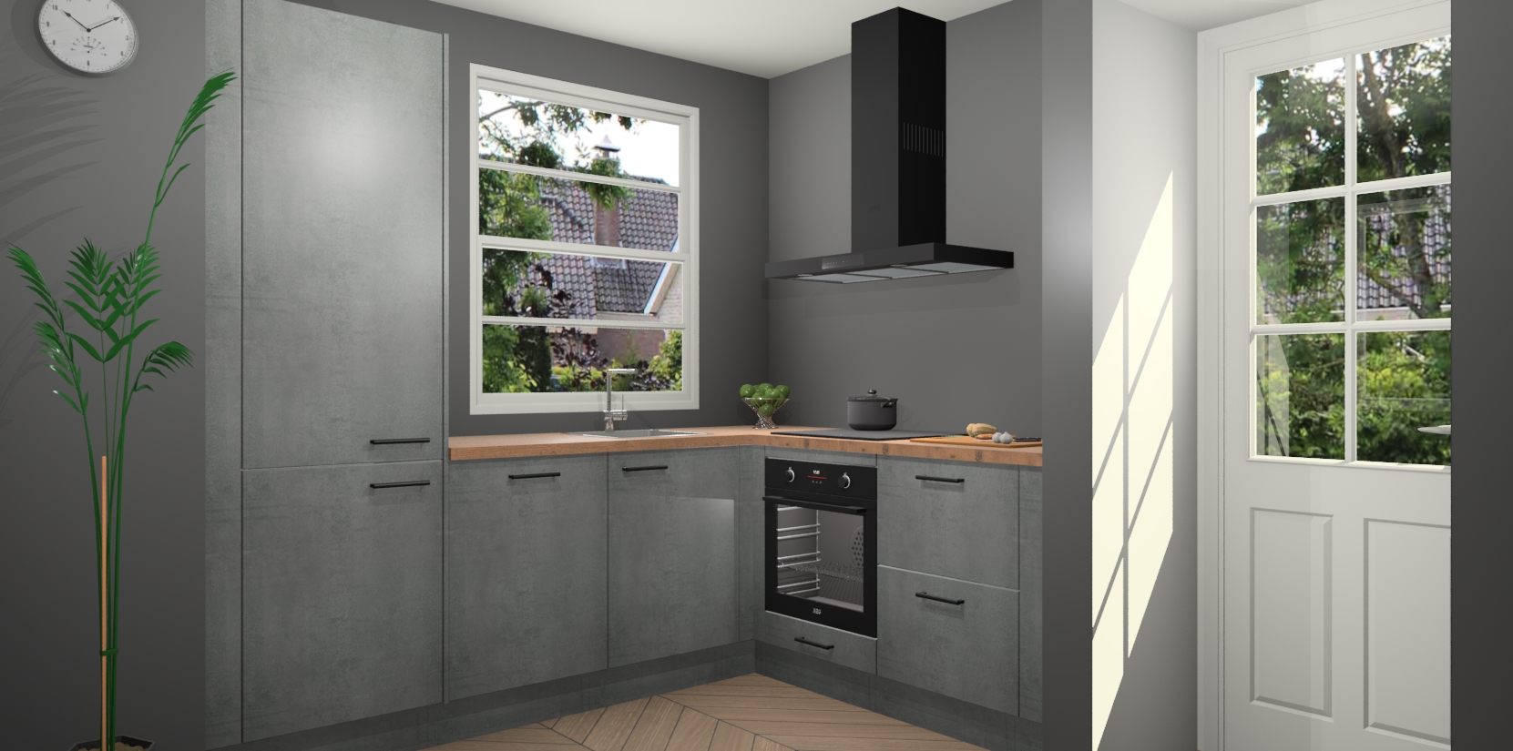 Wilt u een echte aanwinst voor uw keuken, maar bent u op zoek naar iets specialers dan de standaardkeukens? Kies dan voor de Beton Parelgrijs keuken Harbin! Dit prachtige hoekkeukenontwerp geeft u alle ruimte om optimaal te genieten van heerlijk koken. Het uitmuntende afwerkingsniveau, de fraaie houtstructuur en de sfeervolle zwarte grepen maken van de Beton Parelgrijs keuken Harbin de perfecte keuze voor zowel enthousiaste thuiskoks als design-minded interieurliefhebbers.