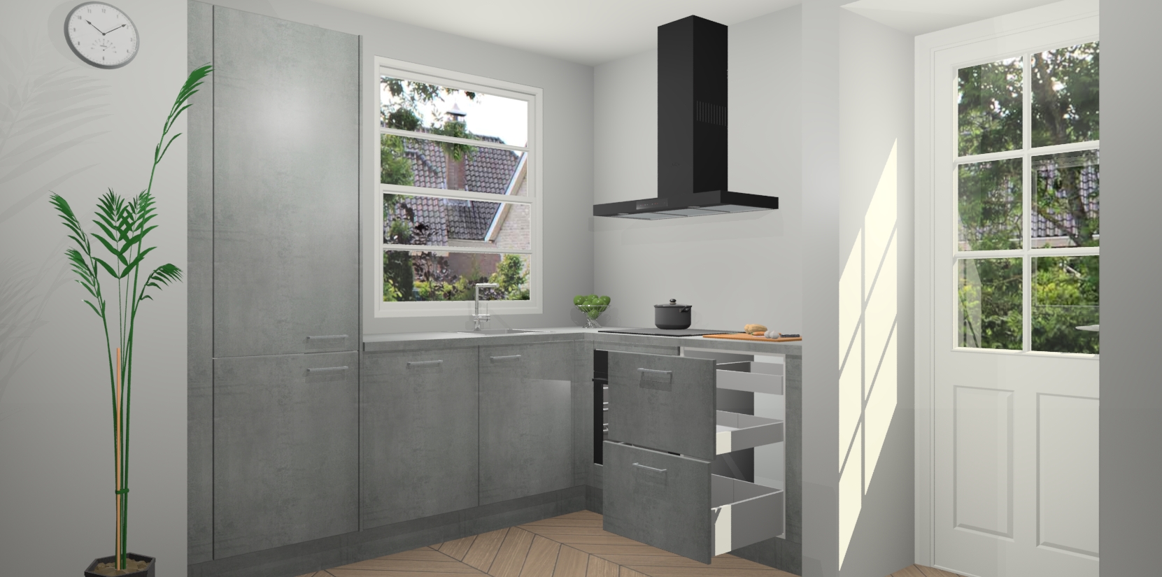 Wilt u een echte aanwinst voor uw keuken, maar bent u op zoek naar iets specialers dan de standaardkeukens? Kies dan voor de Beton Parelgrijs keuken Harbin! Dit prachtige hoekkeukenontwerp geeft u alle ruimte om optimaal te genieten van heerlijk koken. Het uitmuntende afwerkingsniveau, de fraaie houtstructuur en de sfeervolle zwarte grepen maken van de Beton Parelgrijs keuken Harbin de perfecte keuze voor zowel enthousiaste thuiskoks als design-minded interieurliefhebbers.