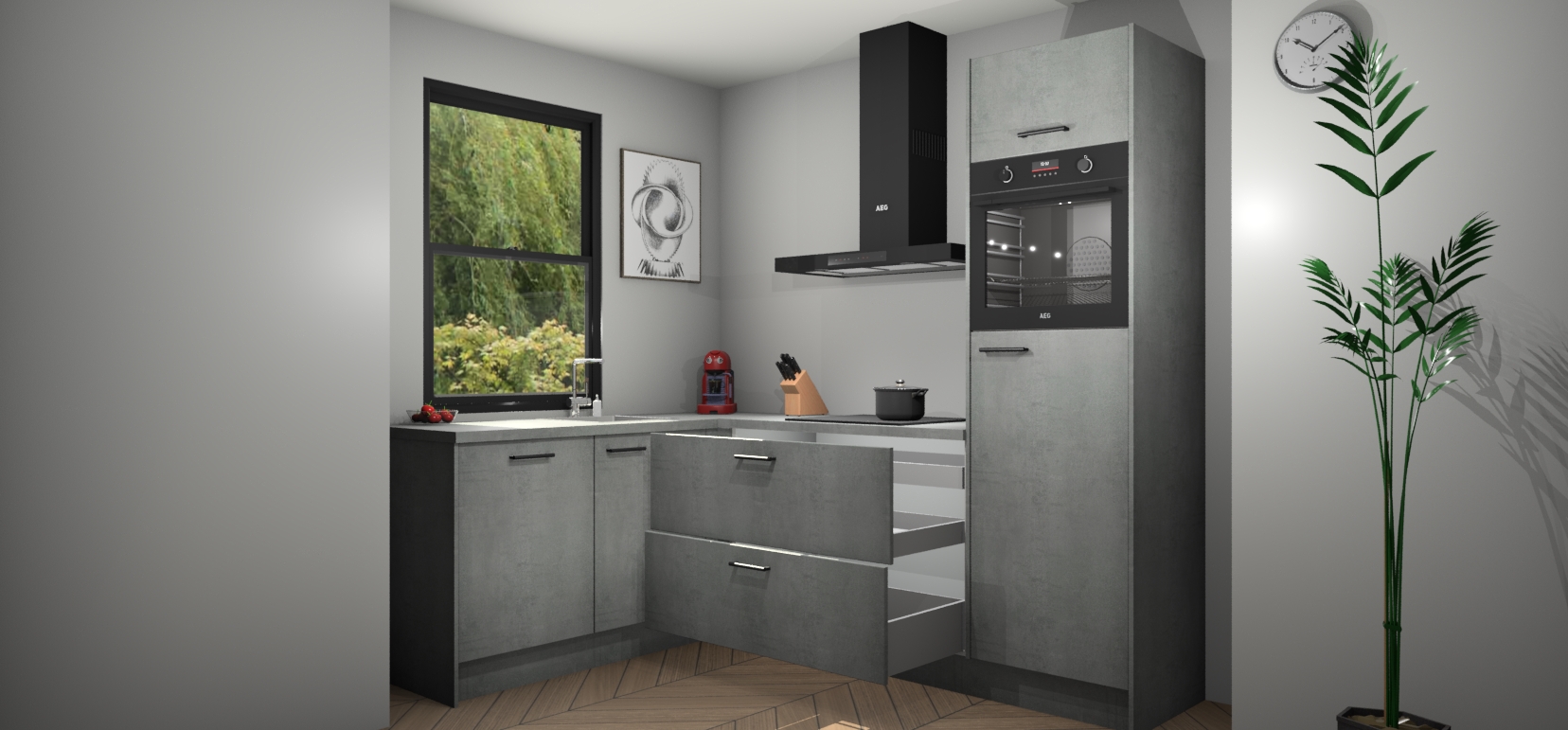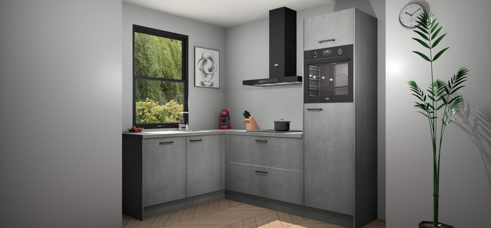 Deze prachtige hoekkeuken heeft alle benodigdheden om uw droomkook- en eetruimte compleet te maken. De Beton Parelgrijs kasten bieden een echo van raffinement, terwijl de 5 inbouwapparaten genoeg opties bieden voor het bereiden van heerlijke maaltijden. De oven, inductiekookplaat, afzuigkap, vaatwasser en koelkast zorgen ervoor dat u tijd in de keuken zo efficiënt mogelijk verloopt, terwijl ze ook dat extra vleugje luxe bieden.