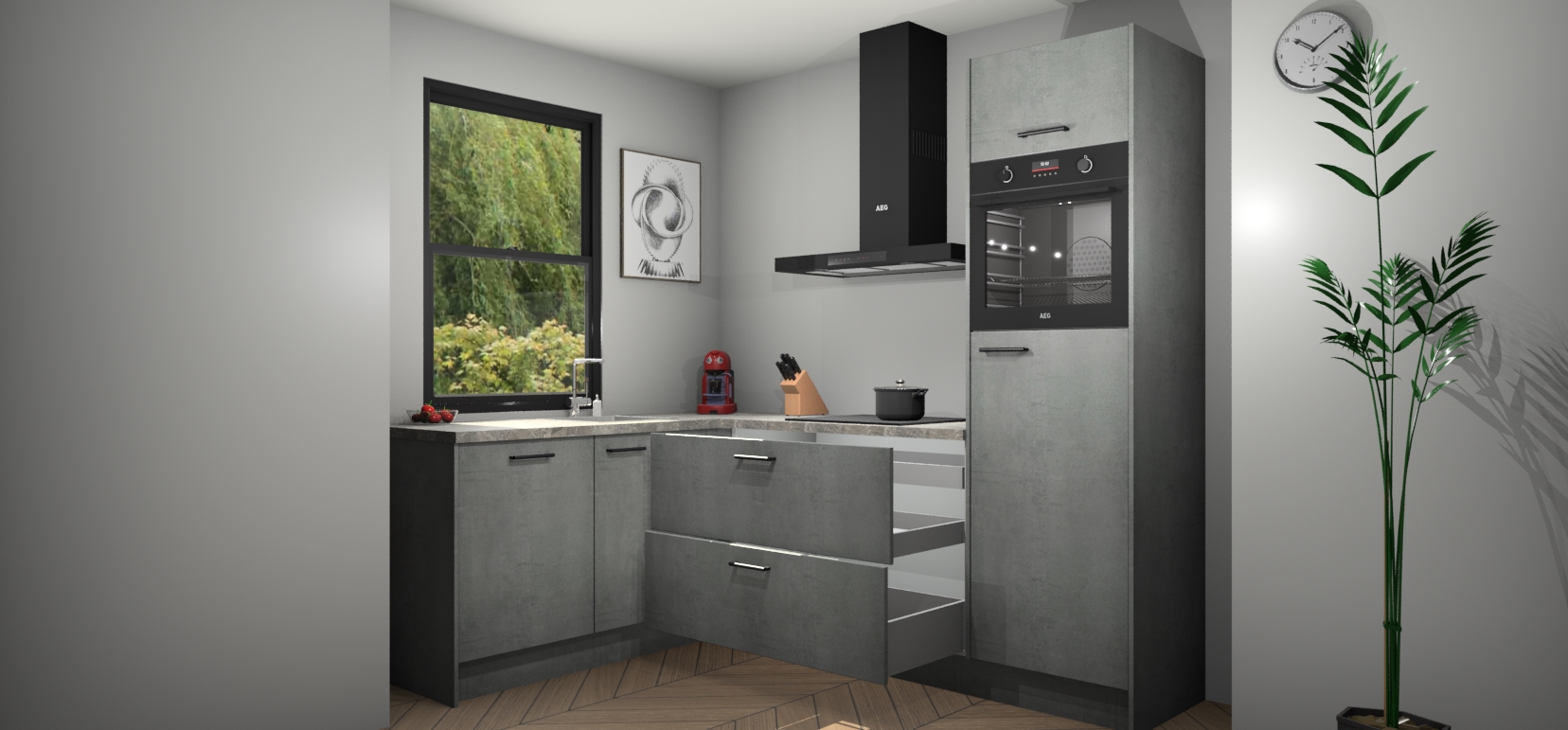 Deze prachtige hoekkeuken heeft alle benodigdheden om uw droomkook- en eetruimte compleet te maken. De Beton Parelgrijs kasten bieden een echo van raffinement, terwijl de 5 inbouwapparaten genoeg opties bieden voor het bereiden van heerlijke maaltijden. De oven, inductiekookplaat, afzuigkap, vaatwasser en koelkast zorgen ervoor dat u tijd in de keuken zo efficiënt mogelijk verloopt, terwijl ze ook dat extra vleugje luxe bieden.