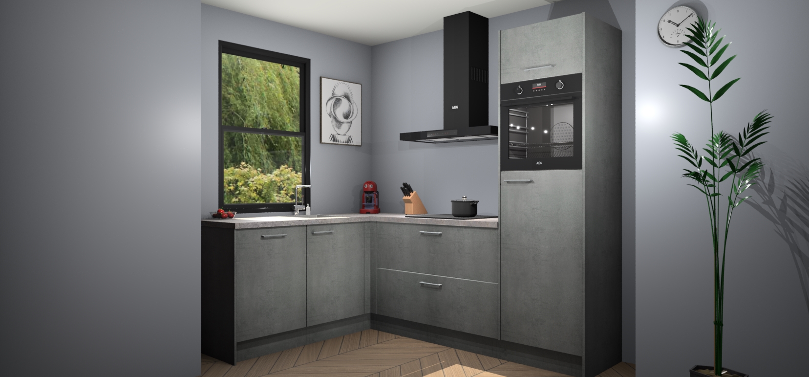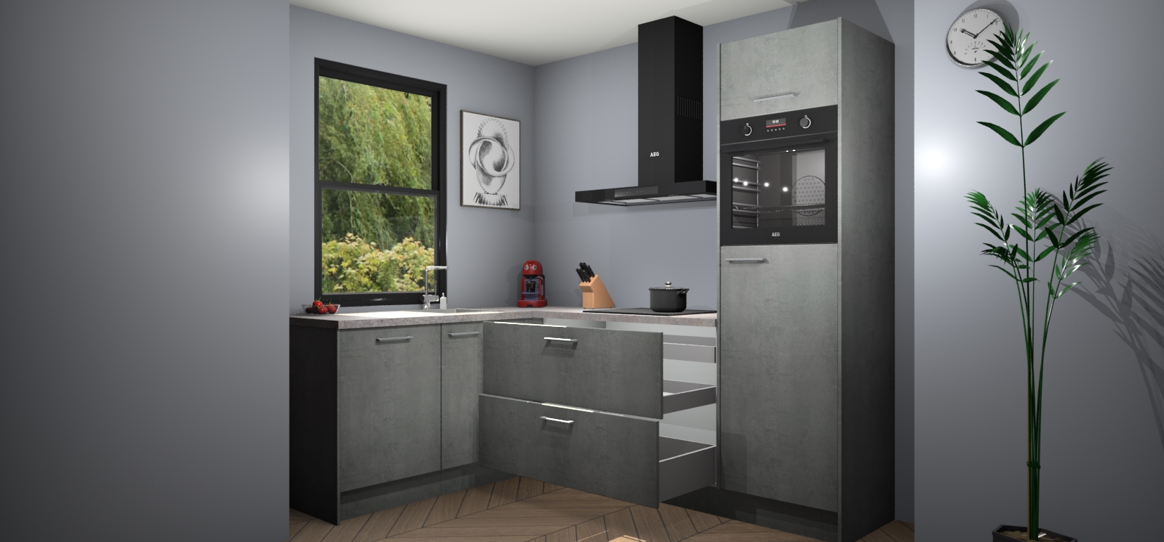 Deze prachtige hoekkeuken heeft alle benodigdheden om uw droomkook- en eetruimte compleet te maken. De Beton Parelgrijs kasten bieden een echo van raffinement, terwijl de 5 inbouwapparaten genoeg opties bieden voor het bereiden van heerlijke maaltijden. De oven, inductiekookplaat, afzuigkap, vaatwasser en koelkast zorgen ervoor dat u tijd in de keuken zo efficiënt mogelijk verloopt, terwijl ze ook dat extra vleugje luxe bieden.