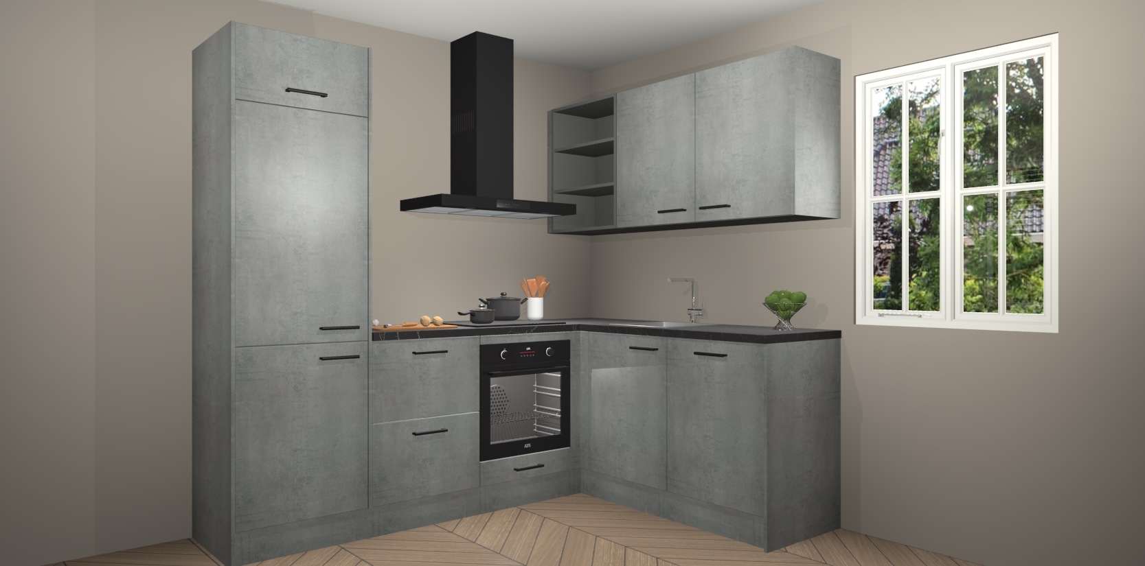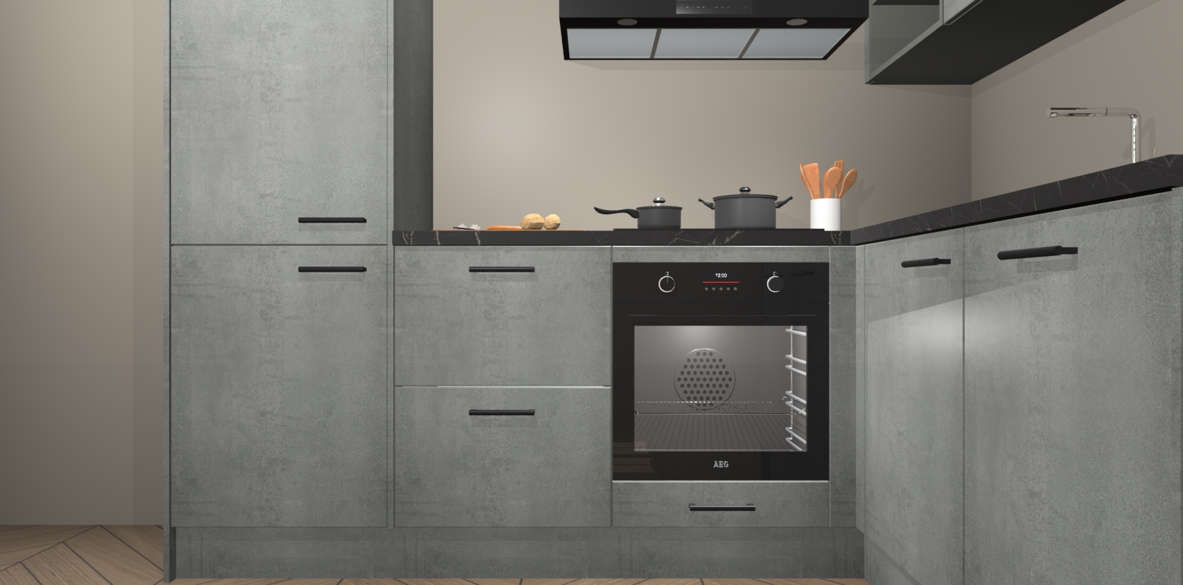 Dit model biedt u voldoende opbergruimte en vijf ingebouwde apparaten: een oven, inductiekookplaat, afzuigkap, vaatwasser en koelkast. Deze apparaten kunnen gemakkelijk worden geüpgrade naar AEG nadat u besteld heeft. De verschillende laden en kastjes bevatten softclose-deuren waardoor ze gezellig dichtvallen met een geruststellend helemaal geruisloos geluid. En dat is nog niet alles! We garanderen ook dat de prijs altijd laag blijft - dus haal nu uw Beton Parelgrijs keuken Krakau terwijl het kan.